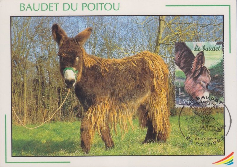 | Commentaire | La race de baudet du Poitou est la plus ancienne race d’ânes reconnue officiellement. Les qualités de reproducteur des baudets du Poitou en font des animaux de grande valeur. Leur robe foncée et velue, aux poils très longs et frisés leur confèrent une aspect des plus originaux. |