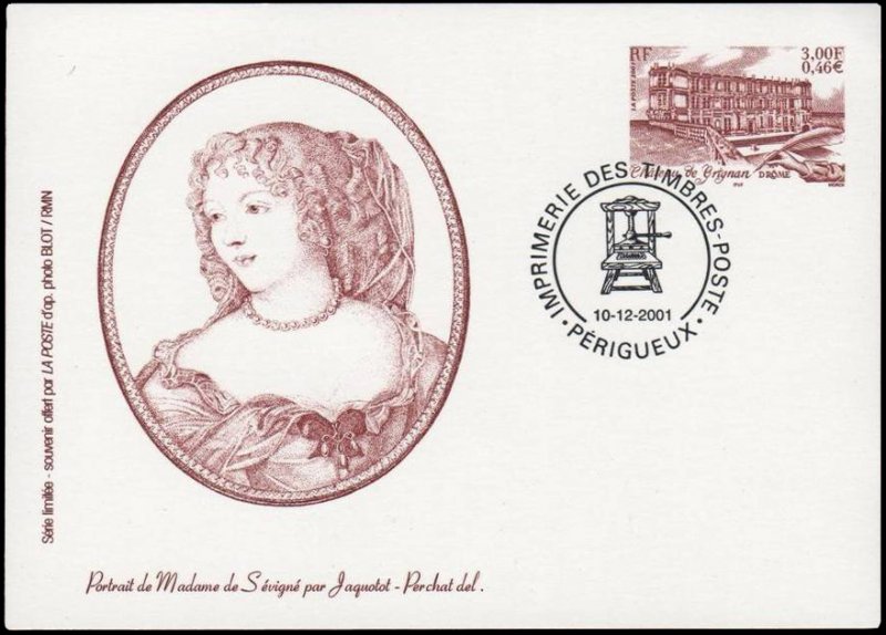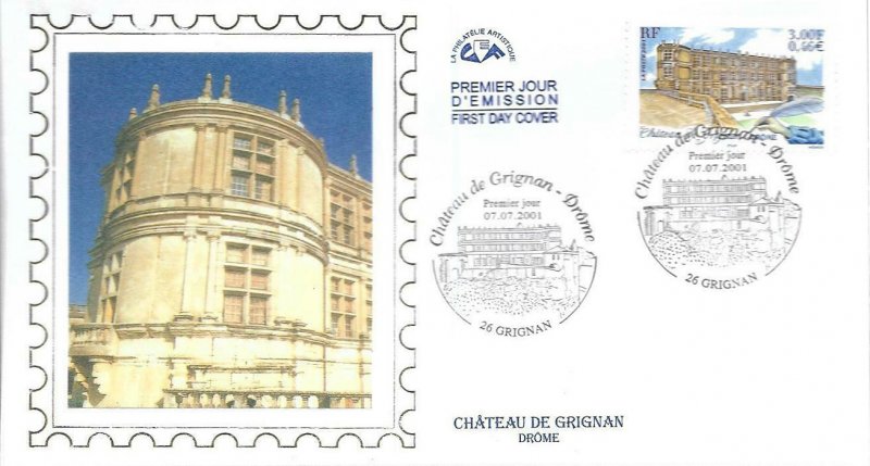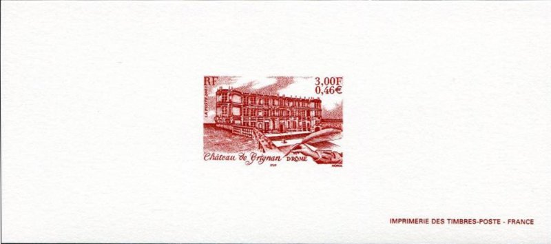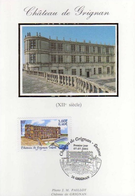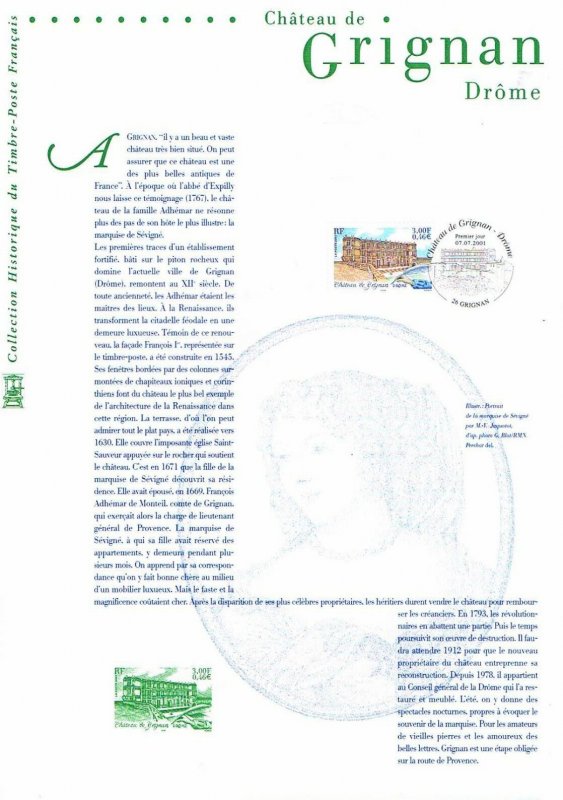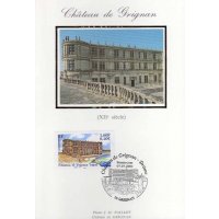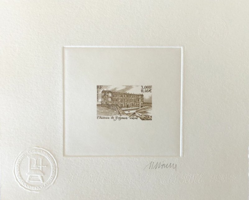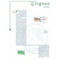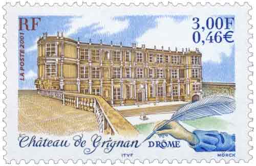 | Commentaire | Description synthétique du visuel du timbre : Le château de Grignan a été construit au XIIe siècle sur un piton rocheux dominant Grignan. Plus grand château de style Renaissance du sud-est de la France, il a été classé monument historique en 1993 et abrite une splendide collection de meubles, tapisseries et tableaux. Le visuel se compose d’une vue du château qu’agrémente une main féminine traçant à la plume le titre du timbre. Elle nous rappelle la grande correspondance de Madame de Sévigné et de sa fille Françoise Marguerite, épouse du comte de Grignan. |