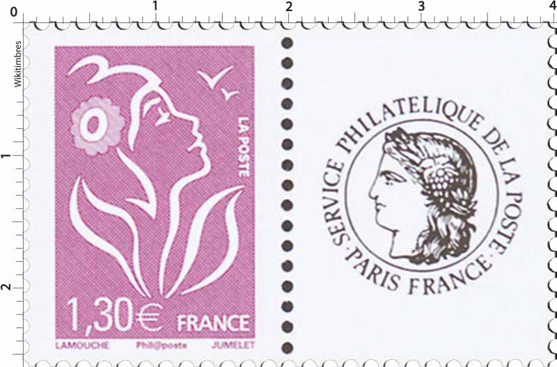 Timbre : SERVICE PHILATÉLIQUE DE LA POSTE - PARIS FRANCE Mesures Format d'imp 15 x 22 mm Dents incluses 40 x 26 mm Forme horizontal Phosphore - Impression - Complément xxxxx Couleur rose Valeur 1,30 € Dentelure - Emis en feuille de 15 TP avec vignette Quantité - Auteurs Dessinateur Thierry Lamouche Graveur Claude Jumelet Mise en page xxxxx Mentions © ADAGP Numéros & Dates N° Philatelix - N° Michel - Date d'émission 01/01/2007 Date de retrait - Classements Groupe Marianne de Lamouche - personnalisé Catégorie TP et Vignettes personnalisées Familles de Lamouche Marianne type Usage - Régions - Départements - Description Type Marianne de Lamouche Commentaire - Mes timbres & notes personnelles www.wikitimbres.fr