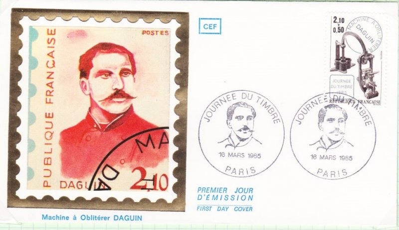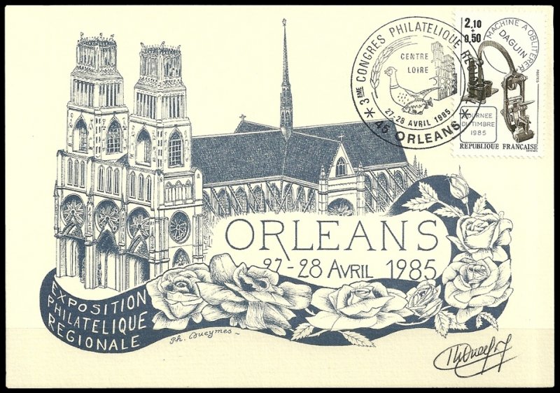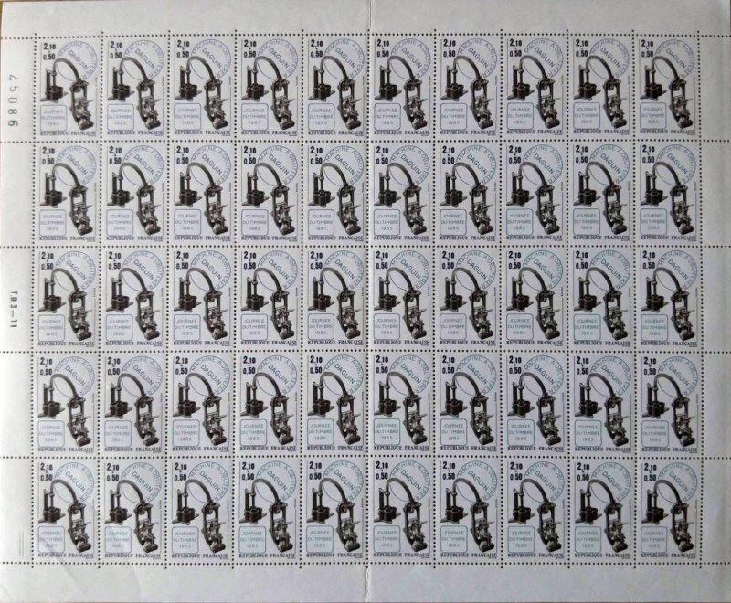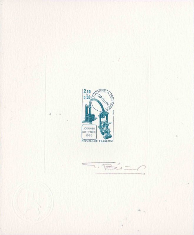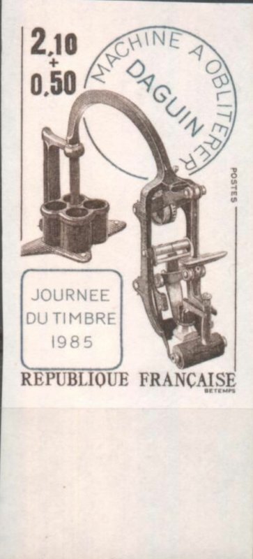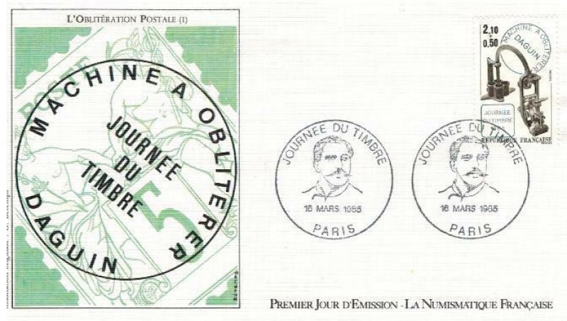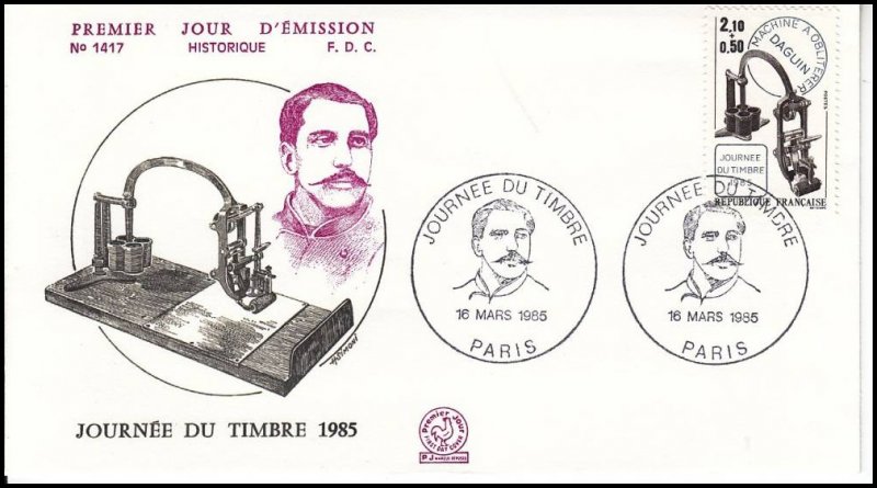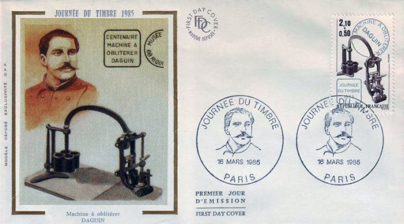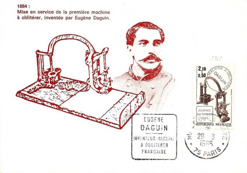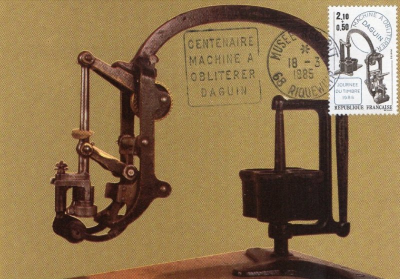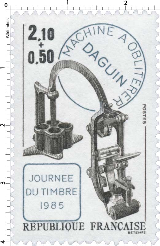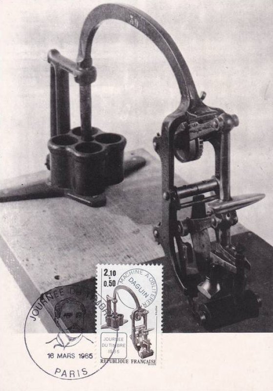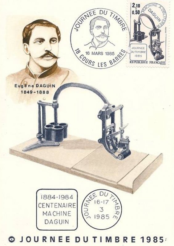 | Description | Journée du Timbre 1985. Machine à oblitérer Daguin. Inventée par Eugène Daguin (1849-1888), né sur la commune de Cours les Barres |