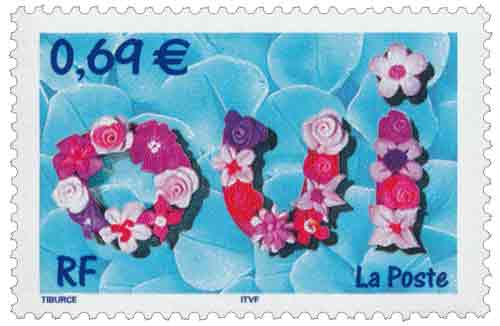 | Commentaire | Description synthétique du visuel du timbre : Des fleurs réalisées en pâte à modeler s’assemblent pour composer le mot « oui » et reposent sur un coussin de pétales d’hortensia réalisé lui aussi en pâte à modeler. Le bouquet de la mariée revisité, dans des couleurs à la fois fraîches et vives. Timbre sans millésime |