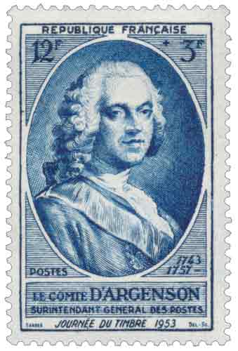 | Description | Journée du timbre 1953. Pierre-Marc comte d'Argenson (1696-1764), surintendant général des postes de 1743 à 1757, né à Paris |
