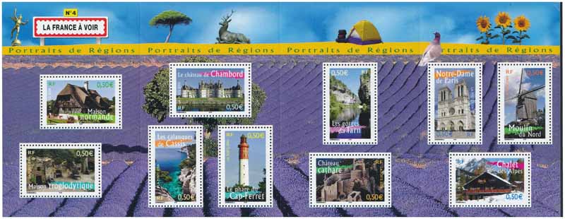 | Commentaire | Portraits de Régions – LA FRANCE À VOIR. La série philatélique Portraits de régions a été inaugurée en 2003. Elle célèbre la France, ses coutumes locales, ses traditions populaires, sa gastronomie, son architecture … Le quatrième bloc rend hommage aux diverses régions de France à travers : le château de Chambord, Notre-Dame de Paris, les gorges du Tarn, un château cathare, les calanques de Cassis, le phare du Cap-Ferret, une maison normande, une maison troglodytique, un chalet des Alpes, un moulin du Nord. |