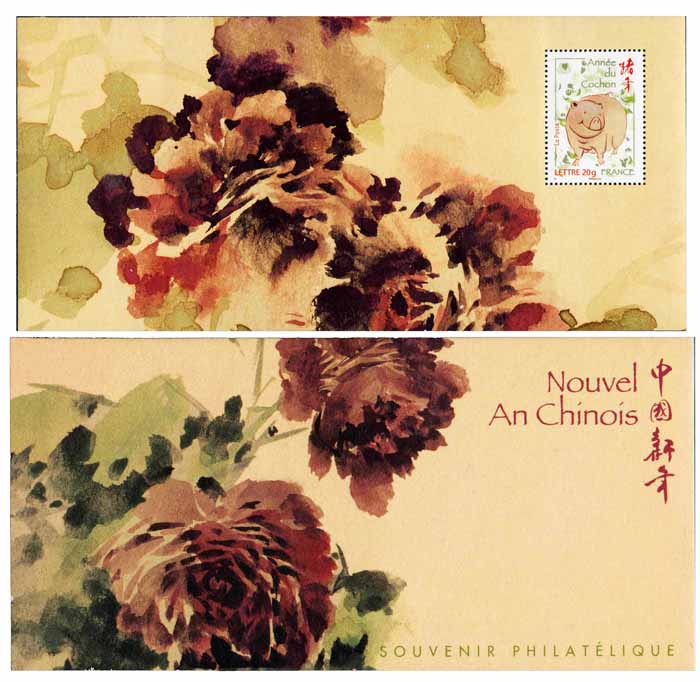 | Description | Année lunaire chinoise du Cochon. T.P. de même date imprimé sur feuillet de 205x95. Lettre 20g Cochon, œuvre originale de Li Zhongyao (4001) |