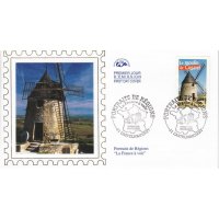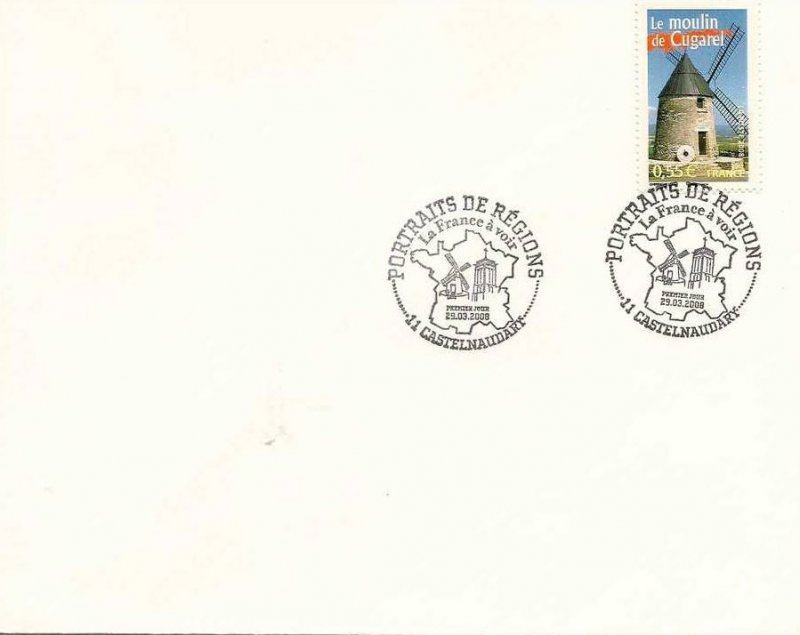 | Commentaire | BF117. Bloc de dix timbres de 0,55 euro La mise en vente anticipée du bloc a lieu dans plusieurs villes concernées par le sujet des timbres : Castelnaudary, Coulon, Honfleur, Paris, Perros-Guirec, Rigny-Ussé, Salazie, Sarlat-la-Canéda, Strasbourg et Vézelay. Le cachet premier jour représente une carte de la France métropolitaine sur laquelle figure un moulin et un clocher. |