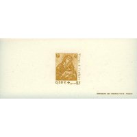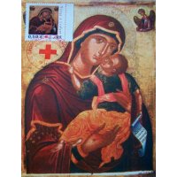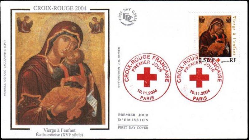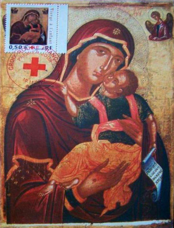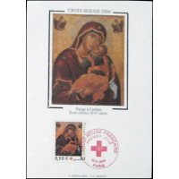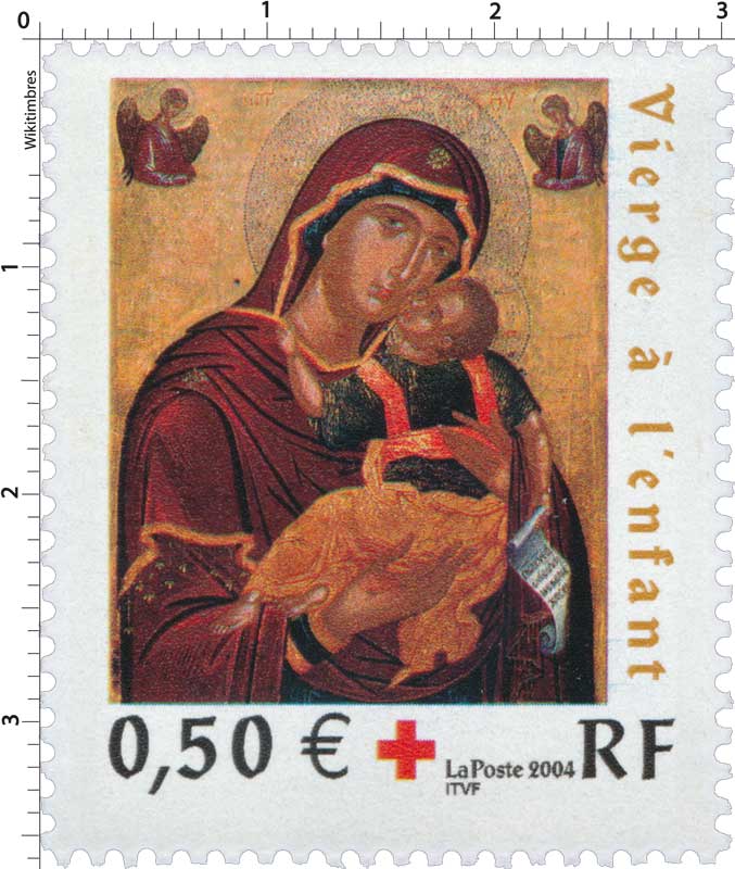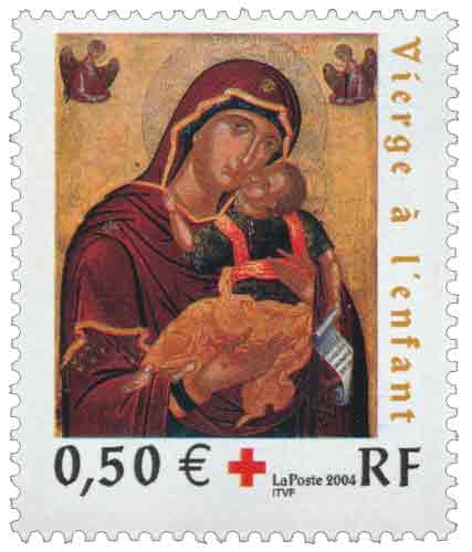 | Commentaire | Après La Vierge à la grappe de Pierre Mignard, La Poste poursuit la série de la Croix-Rouge Française par Vierge à l’enfant, école crétoise (fin 15e siècle) Tempera, gesso et tissu sur support en bois conservée au musée du Louvre. Ce timbre est grevé d'une surtaxe au profit de la Croix Rouge française Émis uniquement en carnet |