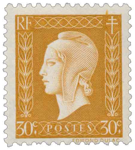| Commentaire | Le timbre gommé « Marianne de Dulac » de 30 centimes bistre, émis en France en 1945, appartient à la série d’usage courant conçue à la Libération pour rétablir une iconographie républicaine claire après la Seconde Guerre mondiale, en reprenant le modèle dessiné et gravé par Edmond Dulac, dont l’effigie de Marianne s’inspire directement de ses travaux réalisés pour des billets de banque français à Londres pendant la guerre, ce qui confère à ce timbre une forte charge symbolique liée au rétablissement de la souveraineté nationale ; mis en vente à partir de juillet 1945 après une diffusion anticipée en mars, il est destiné à l’affranchissement des journaux, s’inscrivant dans un contexte de reprise progressive de la circulation de l’information et de la presse, tout en occupant une place transitoire dans l’histoire des séries Marianne, avant l’adoption de modèles plus durables à la fin des années 1940, et se caractérise par une impression en taille-douce à plat réalisée à Londres par la maison Thomas de la Rue, choix technique et industriel directement lié aux contraintes matérielles de l’immédiat après-guerre. |