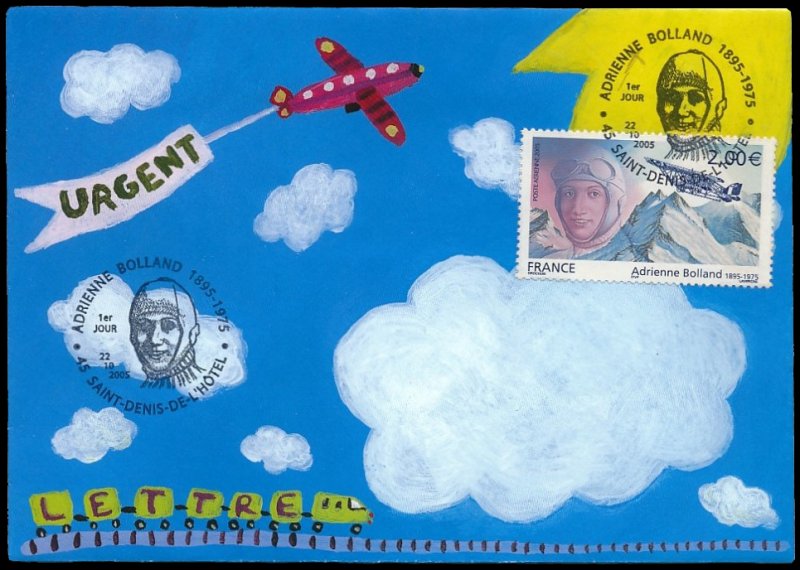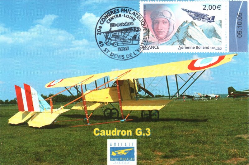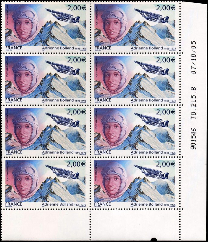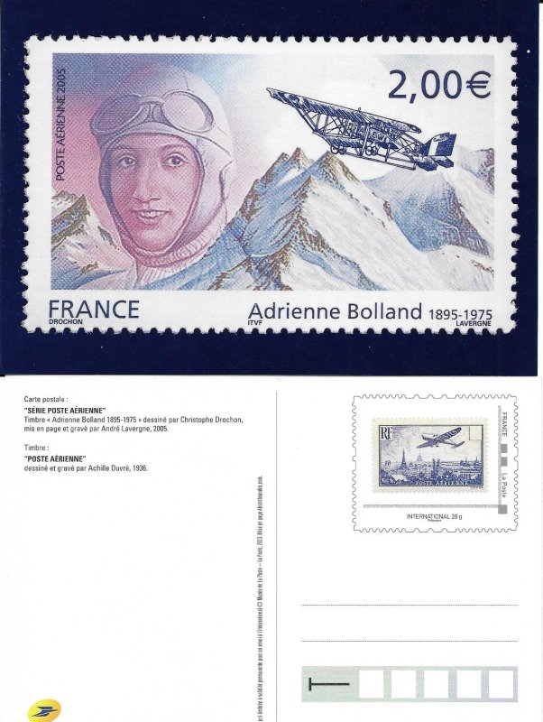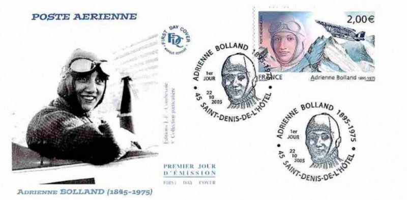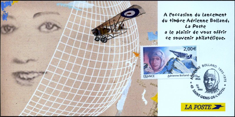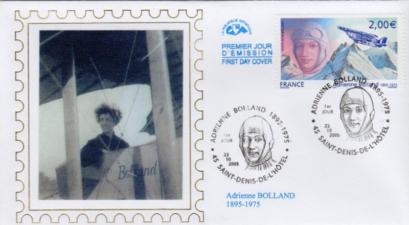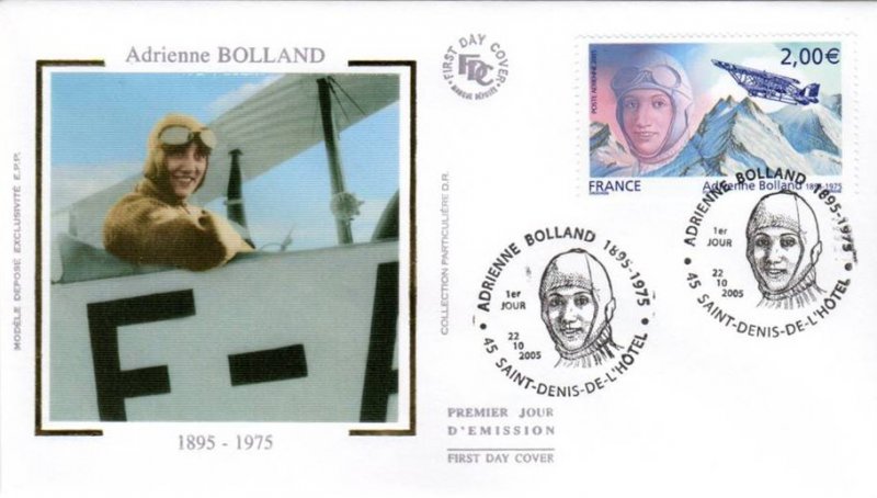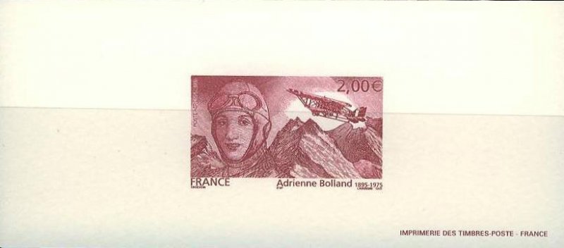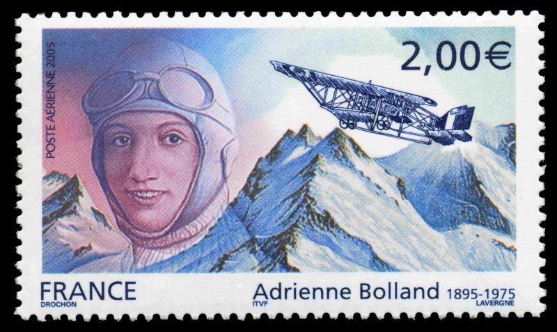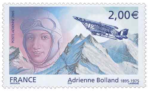 | Commentaire | Adrienne Bolland 1895 - 1975 Adrienne Bolland est née en novembre 1895 à Arcueil. Enfant gâtée d’un publiciste, adolescente frondeuse et indépendante, elle quitte le foyer dès sa majorité. Après quelques années de « jeu » (champs de courses, casinos), elle tente l’aventure de l’aviation. En 1919, après 3 semaines seulement de formation à l’école Caudron, elle effectue ses premiers vols puis est engagé par René Caudron, seule femme dans cet empire masculin. Elle est la première femme à traverser la cordillère des Andes, sur son Caudron G.3, le 1er avril 1921, un exploit retenu pour illustrer le timbre. Partie de Mendoza, elle atterrit à Santiago de Chili, 3 h 15 plus tard … un défi relevé sans compas ni carte. Première femme également à obtenir le brevet de « transport public » en 1922. Suit le record mondial de loopings en 1924 – 212 en 73 minutes, sur un C.127. Elle s’investit ensuite, jusqu’en 1935 environ, aux côtés de son mari, Ernest Vinchon, dans une série de meetings où elle se distinguera par ses évolutions acrobatiques et par son sang-froid. Elle décède à Paris le 18 mars 1975. Enfant terrible de l’aviation, ses mots préférés étaient « justice, amour et liberté » |