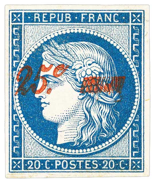 | Commentaire | Cérès - IIème République (non émis) Voir la vidéo "Histoires de timbres" En savoir plus sur Wikipédia : Cérès La surcharge rouge « 25c » apposée sur le 20 centimes bleu relève d’un essai officiel abandonné par l’Administration. Après le changement de tarif du 1er juillet 1850, qui porte la lettre simple à 25 centimes, une tentative est engagée pour réutiliser les feuilles déjà imprimées du 20 c bleu — valeur finalement rendue inutile par la réforme.