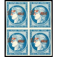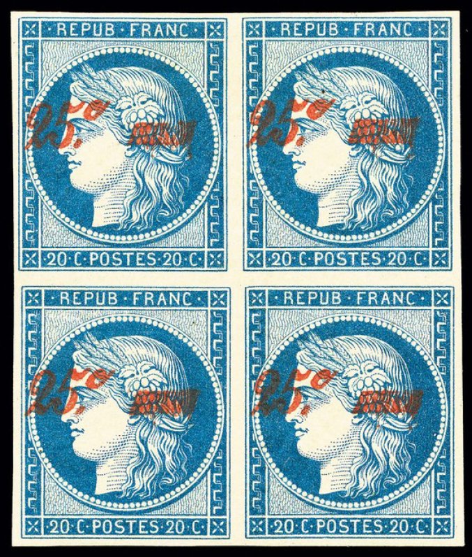 Les exemplaires rencontrés sur le marché philatélique ne proviennent pas des tirages de 1849-1850 mais de la réimpression de 1862, réalisée à la demande de Sir Rowland Hill pour enrichir sa collection. La surcharge rouge « 25c » sur 20 c bleu constitue ainsi l'une des variétés non émises les plus emblématiques des Classiques : une pièce théorique d’usage postal, mais restée au stade d’essai, rarissime dans sa version d’origine et uniquement accessible via les retirages de 1862. |