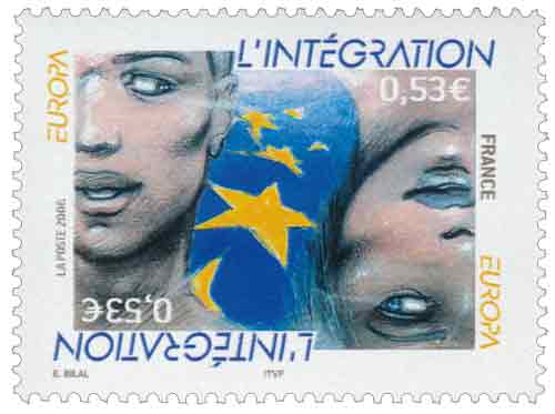 | Commentaire | La série EUROPA est défini chaque année par l’ensemble des pays membres de l’association des opérateurs publics postaux européens, en 2006 il a été retenu pour thème : l’Intégration. La Poste a donc confié la création du visuel du timbre à l’artiste Enki Bilal d’origine yougoslave preuve d’une intégration réussie. Le célèbre illustrateur a illustré le timbre de deux visages en « jouant » sur un dégradé de couleur de peau, la particularité de ce timbre permettant deux sens de lecture différents. |