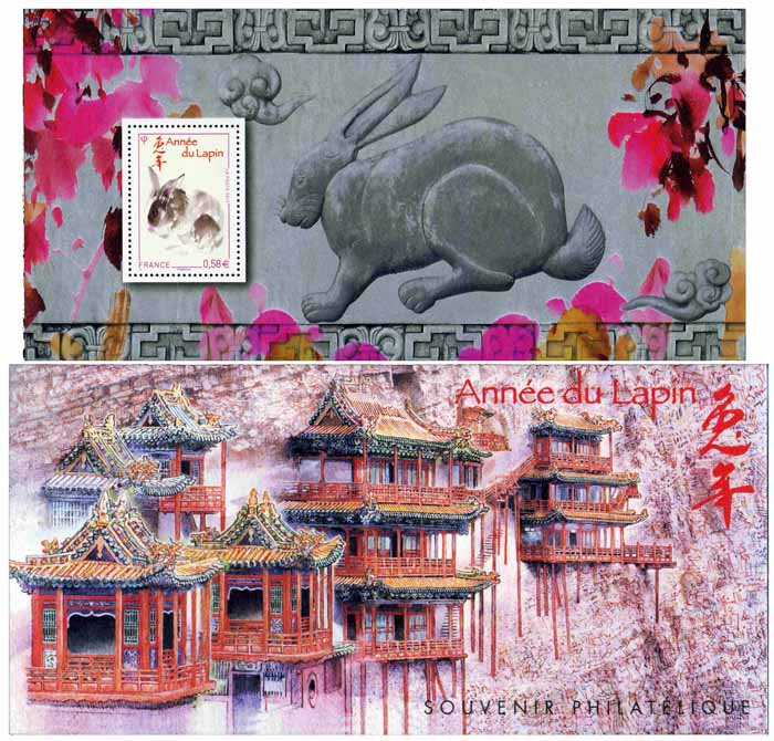 | Commentaire | De l’Année du Rat à l’Année du Cochon, le système astrologique chinois comprend douze signes zodiacaux. Le cycle du zodiaque chinois se renouvelle ainsi tous les douze ans, le signe Lapin étant le quatrième. Celui-ci est décrit comme étant calme, raffiné, narcissique, éloquent et persuasif. L’Année du Lapin débute le 3 février 2011. Timbre à date “Premier Jour” conçu par Zhonghyao Li et Aurélie Baras |