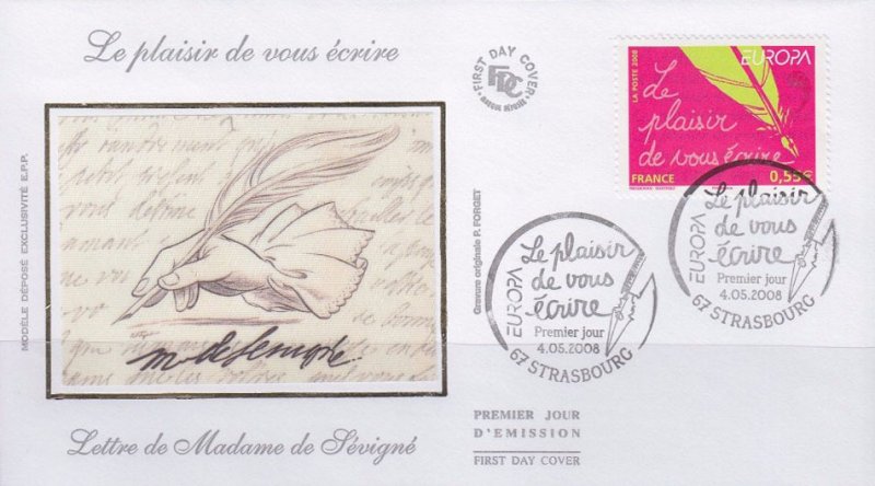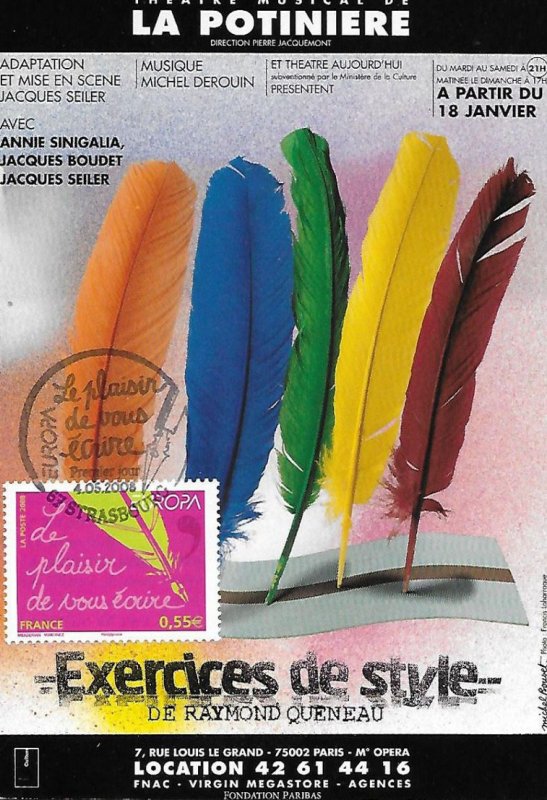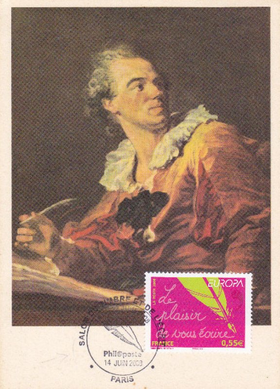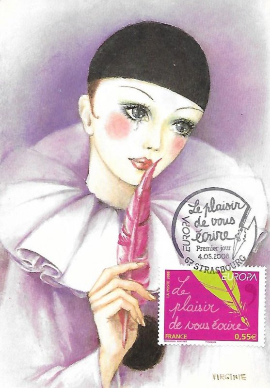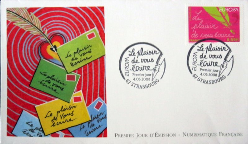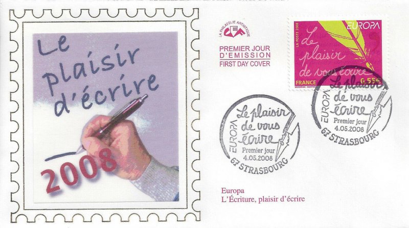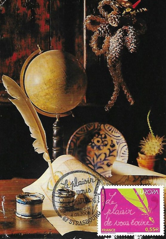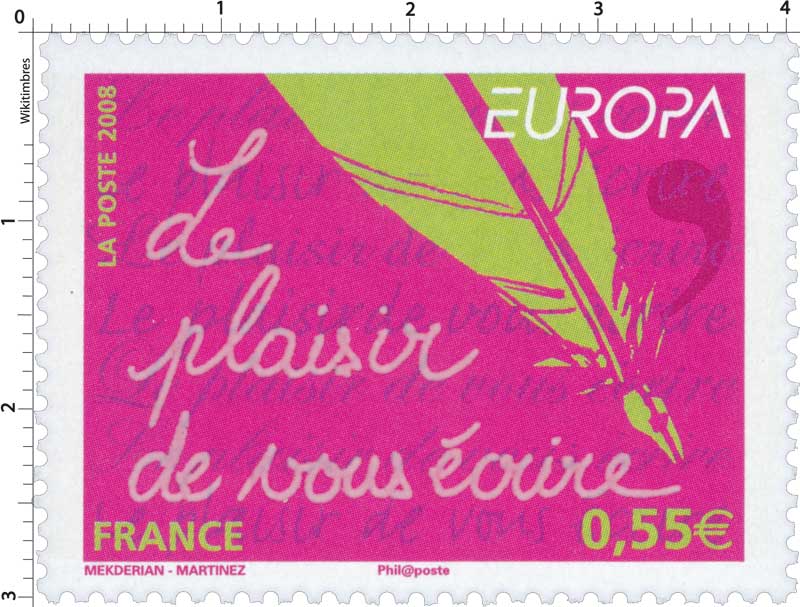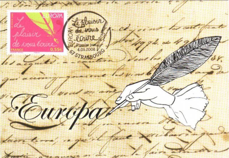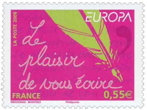 | Commentaire | Existe également en autoadhésif. La mise en vente anticipée a lieu le 4 mai au Parlement européen à Strasbourg. Le cachet premier jour est une plume métallique qui vient d'achever l'écriture de la légende du timbre de France. Les timbres-poste EUROPA sont axés sur un thème unique, commun |