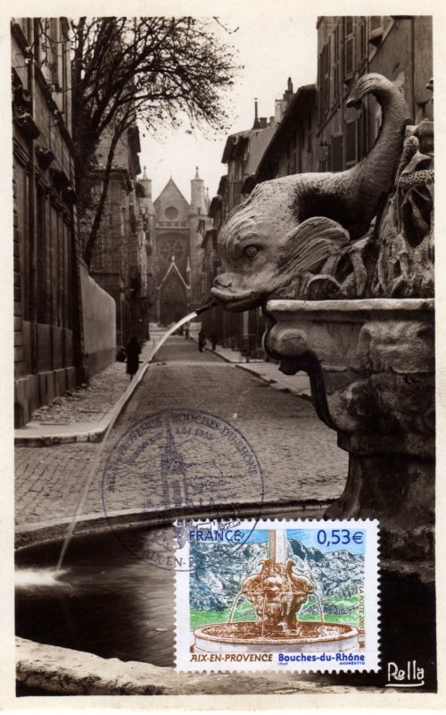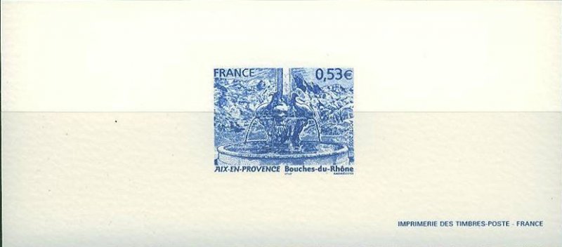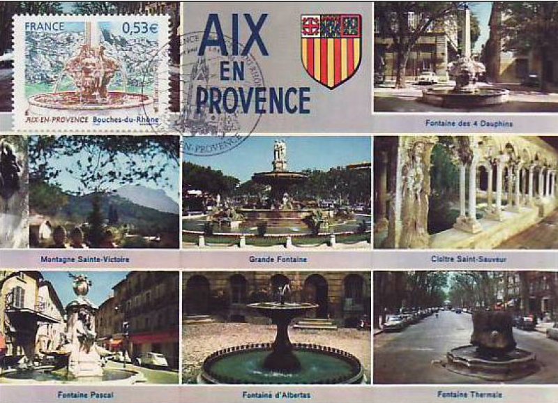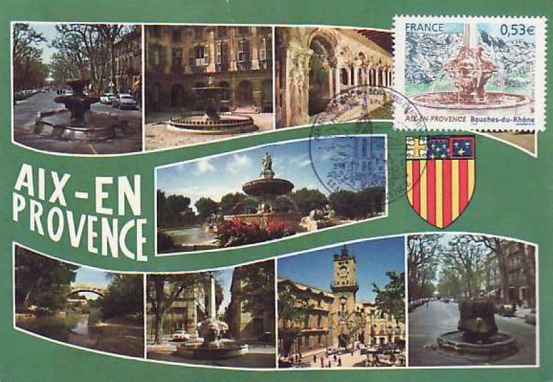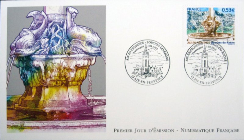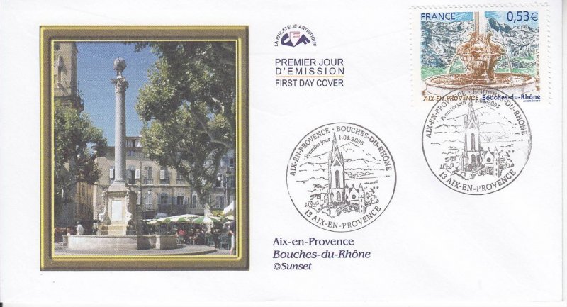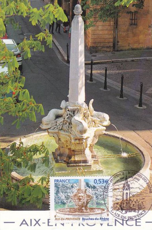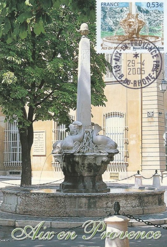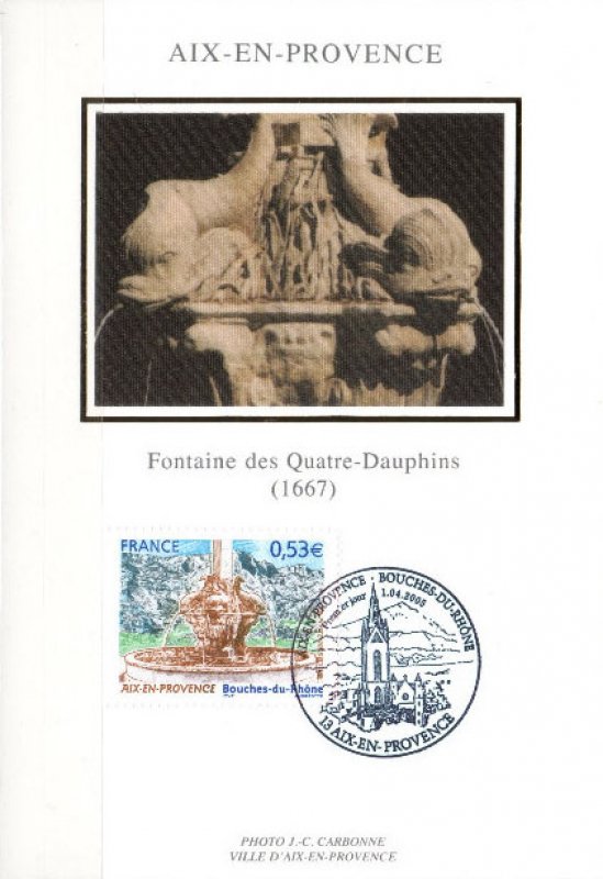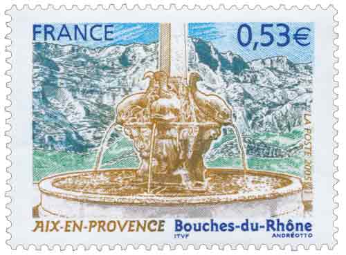 | Commentaire | Le salon philatélique de printemps se tiendra à Aix-en-Provence en 2005. Un timbre rendant hommage à cette ville est émis à cette occasion. Aix-en-Provence fut fondée en –122 (Aquae Sextiae - les « eaux de Sextius ») sur l’emplacement de ses sources thermales, devint colonie sous César, capitale de la Provence au Moyen Âge puis fut rattachée à la France à la fin du XVe siècle sous Louis XII. Elle bénéficie aujourd’hui d’une renommée culturelle et touristique internationale. L’eau qui fit sa richesse est mise à l’honneur sur le timbre par la représentation de l’une des nombreuses fontaines qui agrémentent la ville, la fontaine des Quatre-Dauphins, sculptée par Jean-Claude Rambot en 1667, la plus ancienne après la fontaine Espéluque. En fond la montagne Saint-Victoire. |