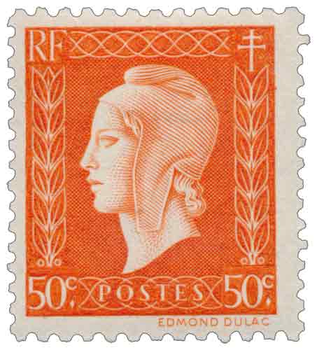| Commentaire | Le timbre gommé « Marianne de Dulac » de 50 centimes orange, émis en France en 1945, appartient à la série d’usage courant mise en place à la Libération pour rétablir une iconographie républicaine claire après l’Occupation, en reprenant l’effigie de Marianne conçue par Edmond Dulac, figure déjà utilisée sur des supports monétaires français pendant la guerre, ce qui inscrit ce timbre dans un contexte historique directement lié à la Seconde Guerre mondiale et à la reconstruction administrative du pays ; mis en vente générale en juillet 1945 après une diffusion anticipée au printemps, il est destiné à l’affranchissement des journaux, répondant à un besoin massif de circulation de l’information imprimée, et s’intègre dans une série transitoire précédant les grandes émissions Marianne de l’après-guerre, tout en se distinguant sur le plan philatélique par une impression en taille-douce à plat réalisée à Londres par la maison Thomas de la Rue, choix industriel dicté par les contraintes techniques et logistiques de l’immédiat après-guerre. |