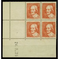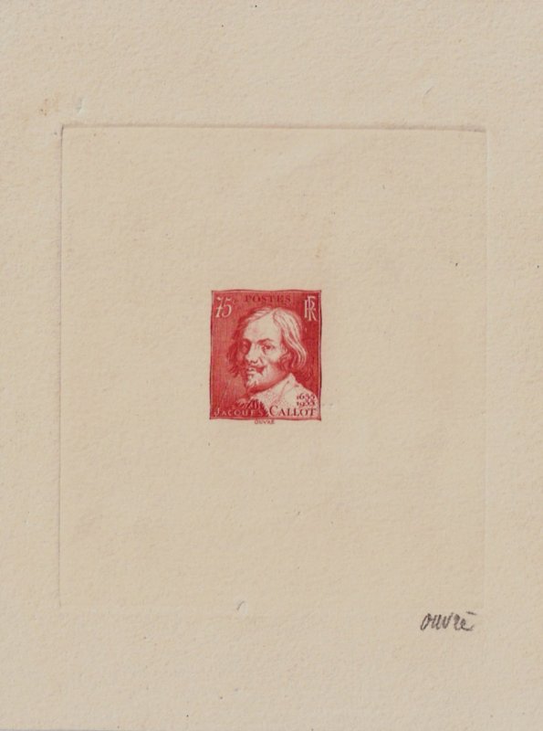 Ce timbre de 1935 rend hommage à Jacques Callot, figure majeure de la gravure lorraine du XVIIᵉ siècle. Achille Ouvré, lui-même graveur d’une grande finesse, adopte ici un style particulièrement adapté au sujet : un trait précis, nerveux, qui évoque les tailles sèches et les eaux-fortes de Callot. Le portrait, inspiré de l’iconographie traditionnelle transmise par ses autoportraits et ses effigies gravées, souligne la vivacité et la personnalité d’un artiste dont l’influence fut immense en Europe. |