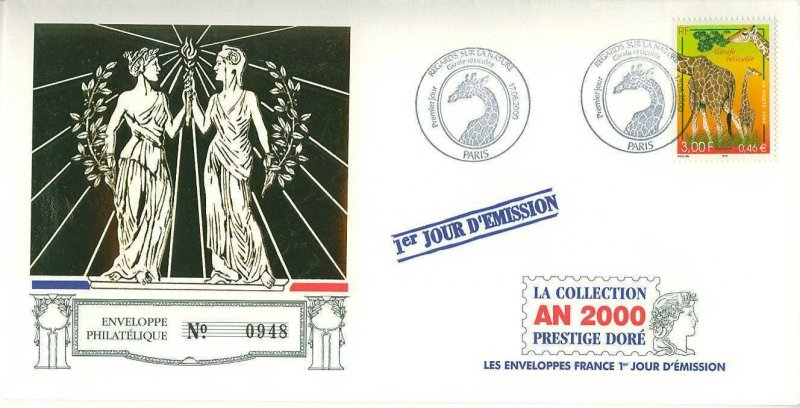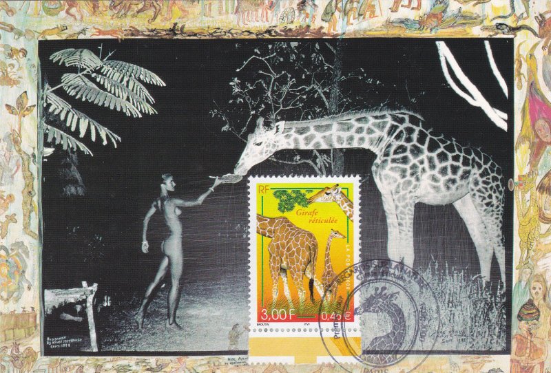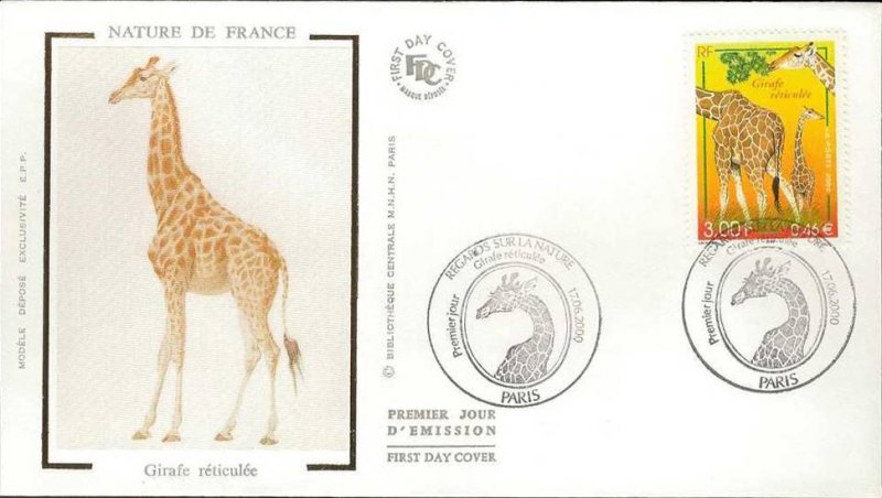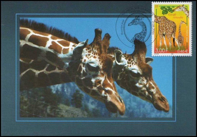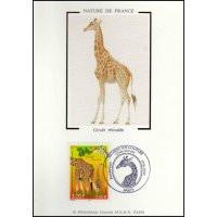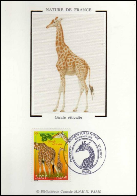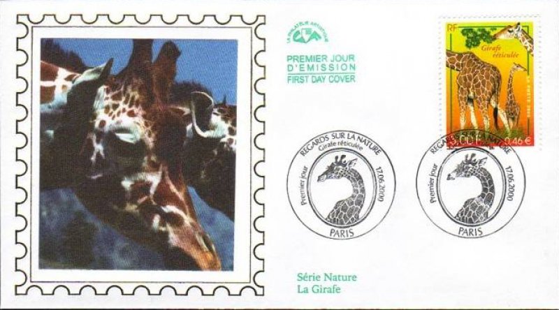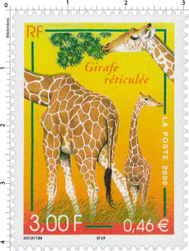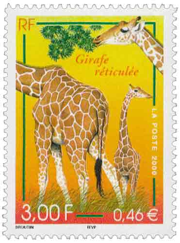 | Commentaire | Description synthétique du visuel du timbre : La girafe réticulée est une sous-espèce dont les taches sont très rapprochées et quasi régulières. Sa haute taille, ses pattes et son cou démesuré en font un animal gracieux et délicat. C’est cette grâce et cette douceur, associées à son caractère pacifique, qui l’ont fait baptiser zurāfa (la gracieuse) par les Arabes. Les girafes réticulées sont présentées dans la galerie de l’Évolution du Muséum national d’histoire naturelle et témoignent de la richesse et de la diversité de la nature. Le procédé graphique consistant à tronquer le sujet pour en répartir sa représentation sur deux timbres, contribue à créer un concept très original. |