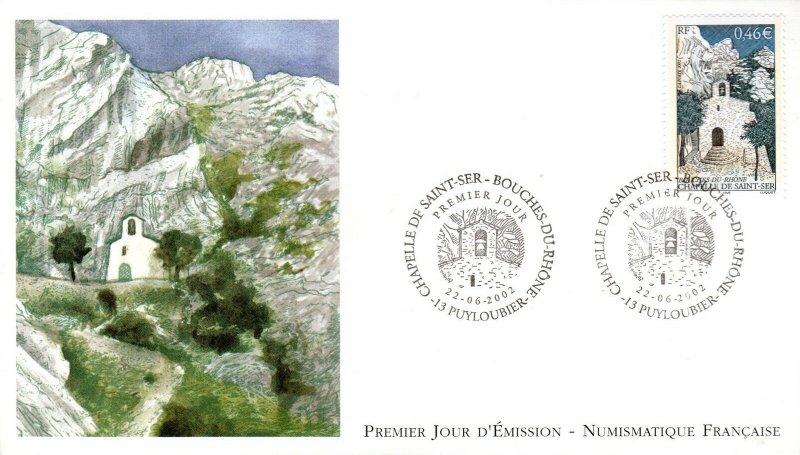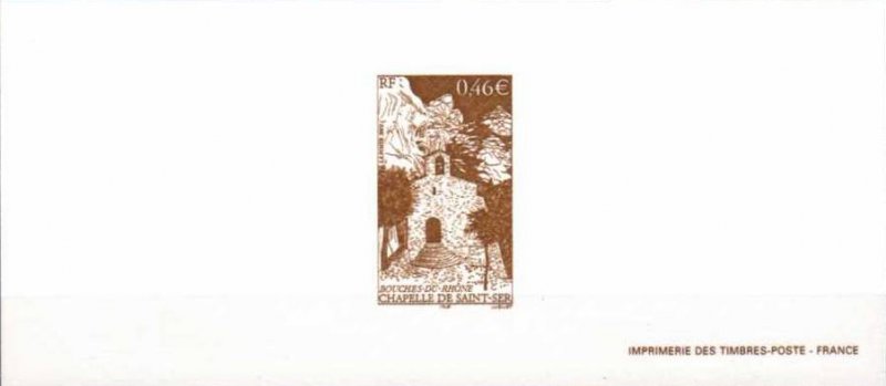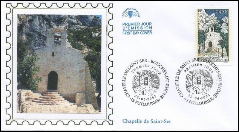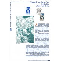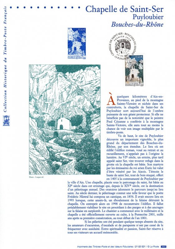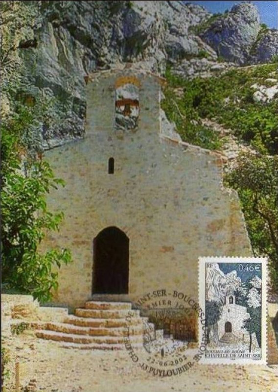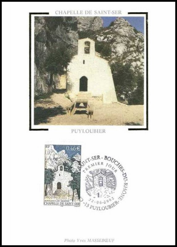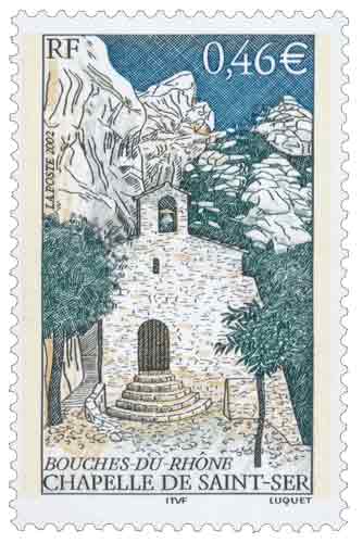 | Commentaire | Description synthétique du visuel du timbre : Dans les contreforts de la montagne Sainte-Victoire, sur la commune de Puyloubier, est édifiée la chapelle dédiée à Saint-Ser, du nom d’un ermite (Ser de servus en latin = serviteur, dans ce cas serviteur de Dieu peut-être) ayant vécu au Ve siècle dans ce décor et dont la réputation de sainteté attira de nombreux visiteurs. Bâtie dans le prolongement d’une grotte, elle fut consacrée en 1001 par l’évêque d’Aix-en-Provence. Depuis le XIVe siècle, cette chapelle est un lieu de pèlerinage annule. Détruite en 1993 suite à une chute de rochers, sa reconstruction s’est achevée en juin 2001. |