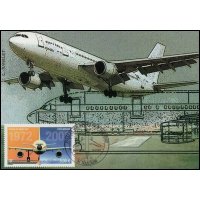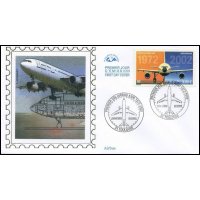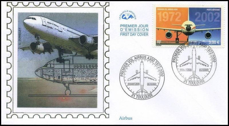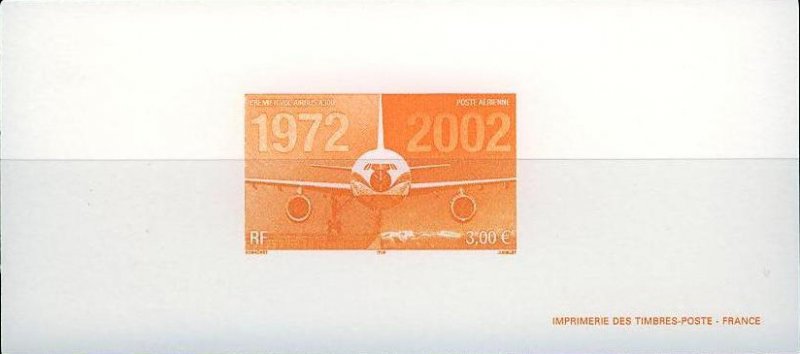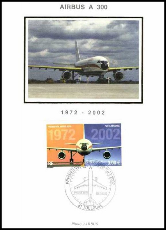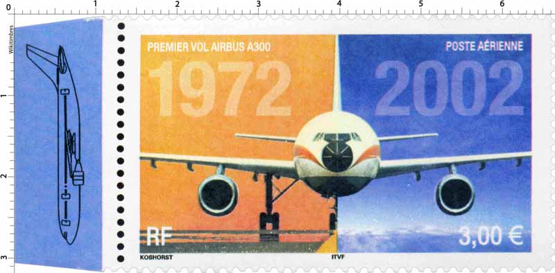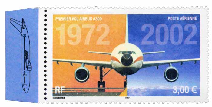 | Commentaire | PREMIER VOL AIRBUS A300 1972-2002 Description synthétique du visuel du timbre : L’airbus A300 est le premier né d’une longue série d’appareils présentant les mêmes conceptions de cockpits, de commandes électriques et les mêmes caractéristiques de pilotage. Ce biréacteurs gros porteur à double couloir a effectué son premier vol en octobre 1972. Il mesure 50,92 m de long, peut accueillir 266 passagers et son rayon d’action s’étend jusqu’à 6850 km. Sur le contour de la mini feuille figurent des plans coupes de l’airbus ainsi que quelques indications techniques. Le même timbre imprimé en feuilles de 40 Tp est dentelé 13 x 13demi. Le timbre du bloc de 10 TP comporte des mentions imprimées dans les marges. Le timbre de feuille comme le timbre du feuillet de 10 TP sont imprimés sur papier avec azurants optiques visibles sous UV. |
