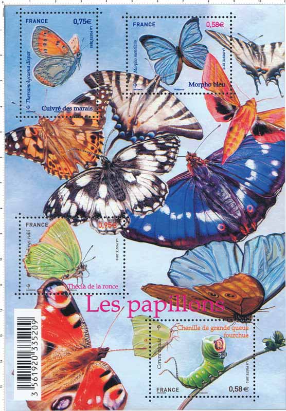 Le papillon, considéré comme un symbole de grâce et de légèreté, représente également la résurrection, le soleil chez les Aztèques, la femme au Japon et l’âme mariée à l’amour dans la mythologie grecque. Le cuivré des marais, le morpho bleu et le thécla de la ronce illustrent chacun un des timbres du bloc Nature 2010, le 4e timbre étant dédié à la chenille du grande queue fourchue. Ces insectes lépidoptères sous leur forme adulte