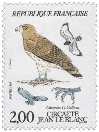 | Commentaire | Ce timbre s’inscrit dans la série « Faune et flore de France – Rapaces diurnes », émise en 1984 par l’administration postale française afin de mieux faire connaître des espèces emblématiques mais souvent méconnues du patrimoine naturel national. Le Circaète Jean-le-Blanc, rapace spécialisé dans la chasse aux reptiles, occupe une place singulière parmi les Accipitridés par son régime alimentaire essentiellement composé de serpents, mais aussi de petits rongeurs et de batraciens. Présent en France au sud d’une ligne allant approximativement de Metz à Rennes, cet oiseau se rencontre aussi bien dans les zones rocheuses et ensoleillées favorables aux reptiles que dans certains massifs forestiers ou secteurs humides riches en amphibiens. Migrateur, il séjourne en Europe de la fin du printemps jusqu’au début de l’automne avant de rejoindre l’Afrique subsaharienne, où il passe l’hiver. L’émission de ce timbre intervient dans un contexte de sensibilisation croissante à la protection des rapaces, longtemps victimes de persécutions humaines et fragilisés par la raréfaction de leurs proies, conséquence de l’assèchement des zones humides et de l’usage intensif de pesticides. À travers ce sujet, la politique postale française met en valeur un oiseau à la fois puissant et menacé, symbole de la biodiversité des paysages français. Ce timbre contribue ainsi à une approche éducative et patrimoniale de la philatélie, en associant la diffusion du courrier à la découverte des espèces protégées et à la prise de conscience des enjeux environnementaux de son époque. Article rédigé pour WikiTimbres |