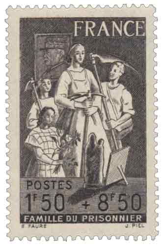 | Commentaire | Famille du prisonnier. Démonétisé le :01/11/1944 Voir la vidéo "Histoires de timbres" L’iconographie montre exclusivement sa famille restée à l’arrière : une femme et des enfants, réunis dans une scène sobre et silencieuse, marquée par l’attente et l’absence. Cette absence visuelle du prisonnier constitue le message central du timbre. Par ce choix iconographique, l’administration postale met l’accent non sur le combattant captif, invisible et lointain, mais sur les conséquences sociales et familiales de sa captivité. Le timbre cherche ainsi à susciter l’émotion et la compassion du public, afin de justifier la surtaxe de 8,50 F, intégralement affectée au secours aux familles de prisonniers de guerre. Dessinée par Élisabeth Faure et gravée par Jules Piel, la composition se distingue par un style réaliste et contenu, évitant toute représentation militaire ou héroïque. La scène est volontairement domestique, presque intime, renforçant le sentiment de vulnérabilité et de dépendance économique des familles privées de leur soutien principal. Mis en vente le lundi 27 septembre 1943, le timbre est retiré de la vente le 17 février 1944. Comme la majorité des émissions liées au régime de Vichy, il est démonétisé le 1er novembre 1944, après la Libération. Ce timbre constitue un exemple caractéristique de l’usage postal comme outil de communication idéologique, où l’image, la surtaxe et le contexte politique se combinent pour orienter la perception du public, en faisant de l’absence du prisonnier un argument moral et financier.