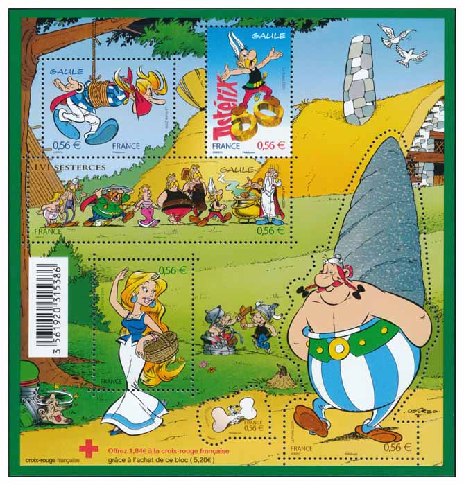 | Commentaire | Visuel : les personnages principaux de la série, avec le plus petit timbre émis, "Idéfix", mais également le plus gros "Obélix" et son menhir recouvert de poudre de pierre, un TP en "sesterces", quelques TP de "gaulois"... et peut-être le secret de la potion magique (et autres micro texte) sur le TP de la distribution de boisson énergisante, du druide Panoramix. Pour fêter les 50 ans d’Astérix en 2009, La Poste émet un bloc de 6 timbres-poste particulièrement original. Vous y verrez le timbre le plus petit jamais émis, « Idéfix », mais aussi le timbre le plus gros et le plus lourd, « Obélix » et son menhir recouvert de poudre de pierre, un timbre en sesterces, quelques timbres « gaulois »... et en cherchant bien vous trouverez peut-être le secret de la potion magique (et quelque autre micro texte !!) sur le timbre Panoramix |