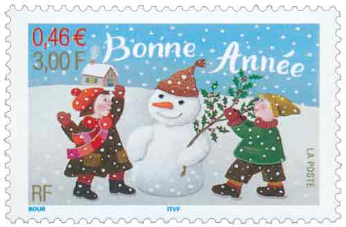 | Commentaire | Description synthétique du visuel du timbre : A l’inverse de l’année précédente, les timbres Bonne Année et Meilleurs Vœux offrent une vision plus figurative des fêtes de fin d’année. Le visuel gai et naïf qui illustre le timbre Bonne Année met en scène des enfants autour d’un bonhomme de neige. Il renvoie à une imagerie simple qui rappelle que ces fêtes sont aussi celles des enfants. Timbre sans millésime |