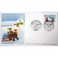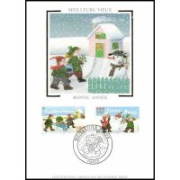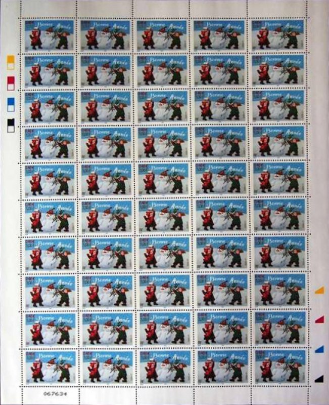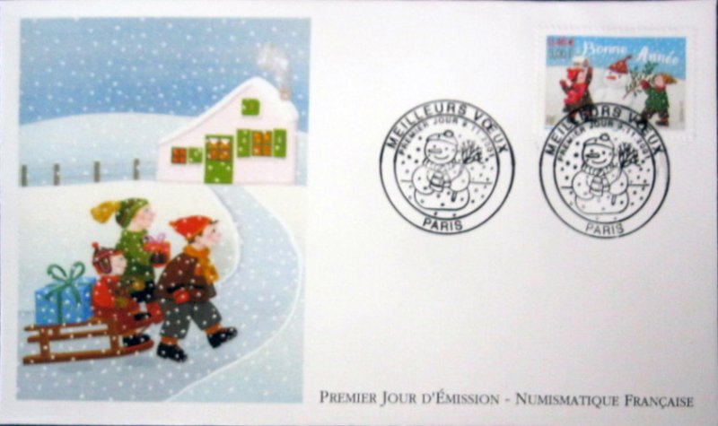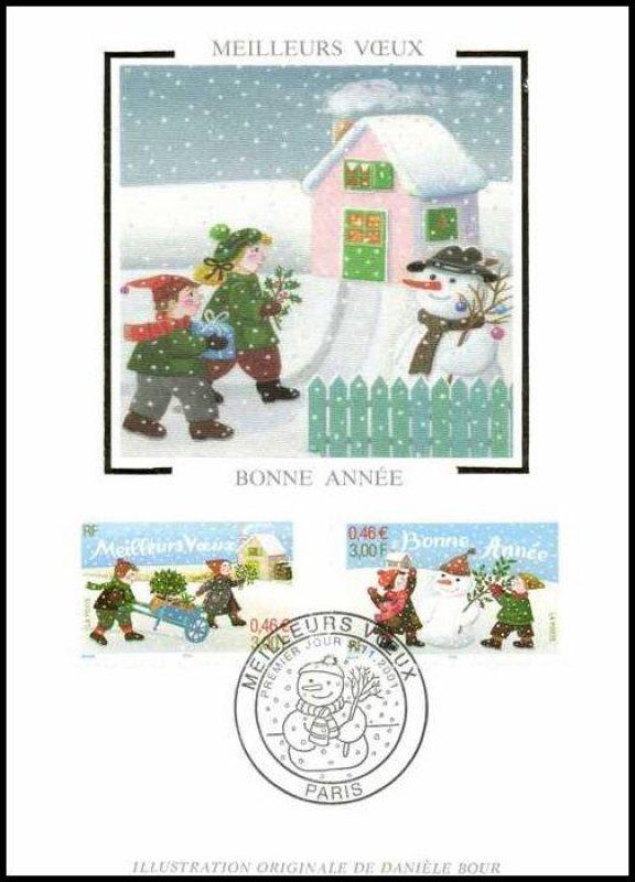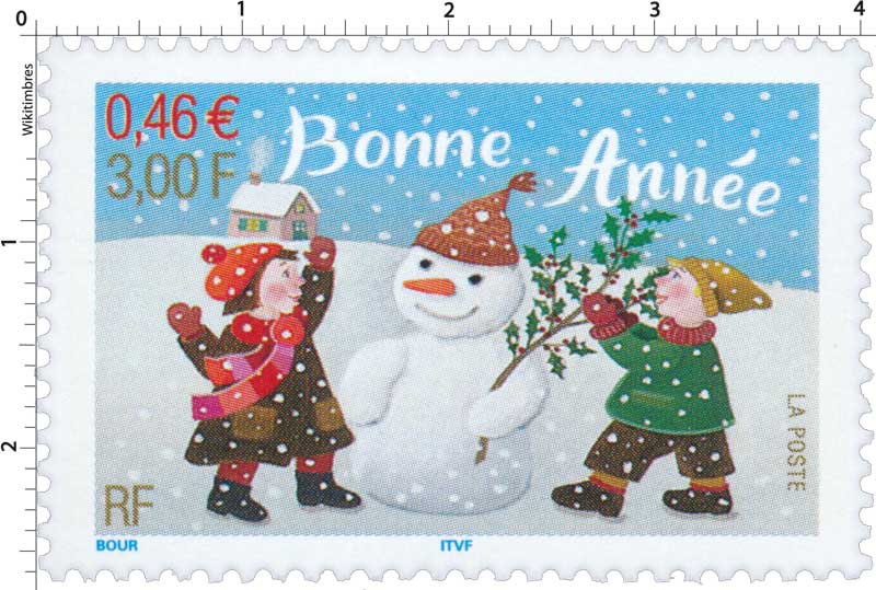 | Commentaire | Description synthétique du visuel du timbre : A l’inverse de l’année précédente, les timbres Bonne Année et Meilleurs Vœux offrent une vision plus figurative des fêtes de fin d’année. Le visuel gai et naïf qui illustre le timbre Bonne Année met en scène des enfants autour d’un bonhomme de neige. Il renvoie à une imagerie simple qui rappelle que ces fêtes sont aussi celles des enfants. Timbre sans millésime |