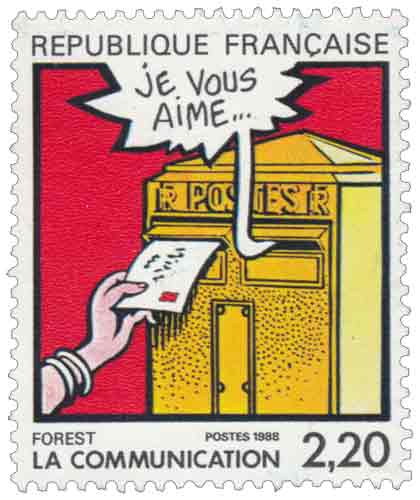 | Commentaire | Ce timbre est issu du carnet « La Communication par douze auteurs de la bande dessinée française », émis au début de l’année 1988 dans un contexte de reconnaissance institutionnelle durable du neuvième art en France. Depuis le milieu des années 1970, la bande dessinée a progressivement quitté le statut d’expression marginale pour s’imposer comme un champ culturel légitime, soutenu par le Festival international d’Angoulême, par l’enseignement spécialisé et par l’intérêt croissant des institutions culturelles. Cette évolution explique le choix de l’administration postale de confier l’illustration d’un thème aussi central que la communication à douze figures majeures de la bande dessinée française, chacune apportant une lecture singulière de ce sujet en lien direct avec la mission historique de la Poste. Ce timbre, dessiné par Jean-Claude Forest, s’inscrit dans cette démarche collective et témoigne de l’ouverture de la politique philatélique française aux formes graphiques issues de la bande dessinée dite adulte. Forest occupe une place essentielle dans l’histoire du médium, notamment pour son rôle dans le renouvellement des thèmes, des formes narratives et du rapport au lecteur à partir des années 1960. Son œuvre, marquée par l’imaginaire, le symbolisme et une liberté graphique assumée, a contribué à élargir les frontières de la bande dessinée francophone et à en affirmer la dimension artistique. Dans le cadre de ce carnet, son interprétation de la communication renvoie à une conception où l’image et le récit deviennent des vecteurs autonomes de sens, en écho aux mutations culturelles et médiatiques de la fin du XXe siècle. Ce timbre illustre ainsi la volonté de la philatélie française de valoriser des auteurs dont l’influence dépasse le cadre strict de la bande dessinée et de témoigner, par l’objet postal, de l’intégration pleine et entière de ce médium dans le patrimoine culturel national. Article rédigé pour WikiTimbres |