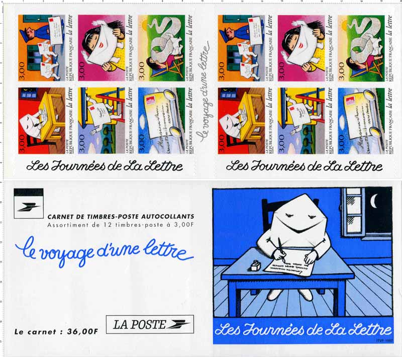 Timbre : 1997 Les journées de la lettre le voyage d'une Lettre Mesures Format d'imp - Dents incluses 86 x 200 mm Forme vertical Phosphore Non Impression héliogravure Complément xxxxx Couleur polychrome Valeur 3 F Dentelure 13 x 13 1/2 Emis en carnet de 12 TP Quantité 7 439 291 Auteurs Dessinateur Henri Galeron Graveur xxxxx Mise en page xxxxx Mentions Création d'Henri Galeron Numéros & Dates N° Philatelix - N° Michel - Date d'émission 12/05/1997 Date de retrait 07/05/1998 Classements Groupe Semi-permanent 1997 La lettre Catégorie Carnets commémoratifs Familles bandes dessinées loisirs sport et loisirs Usage lettres simples Régions - Départements - Description Les journées de la lettre Commentaire - Mes timbres & notes personnelles www.wikitimbres.fr