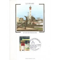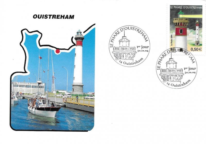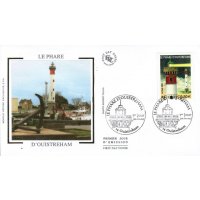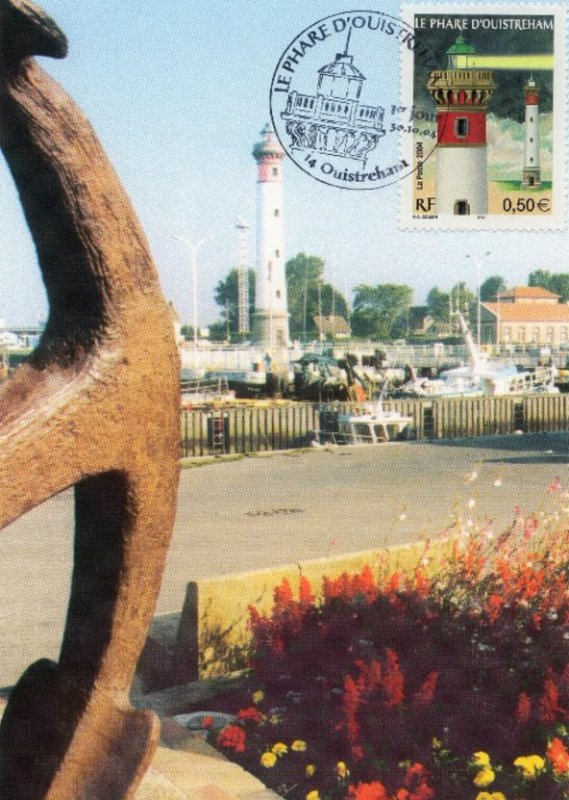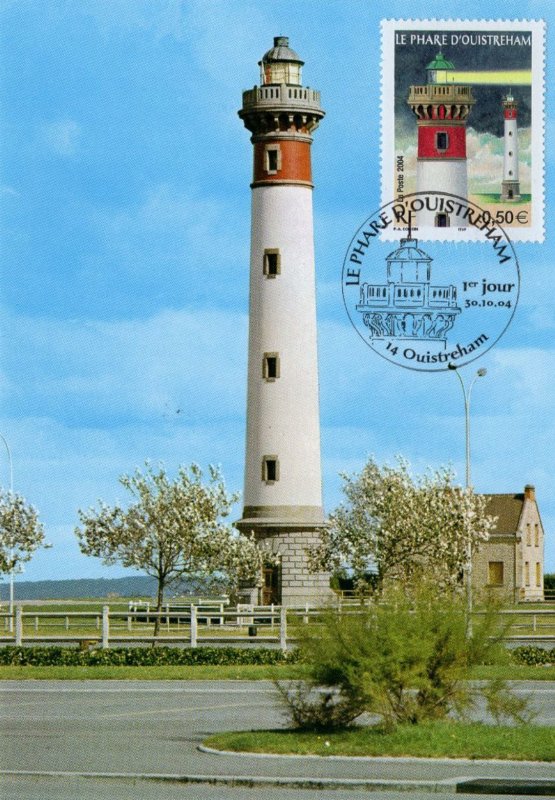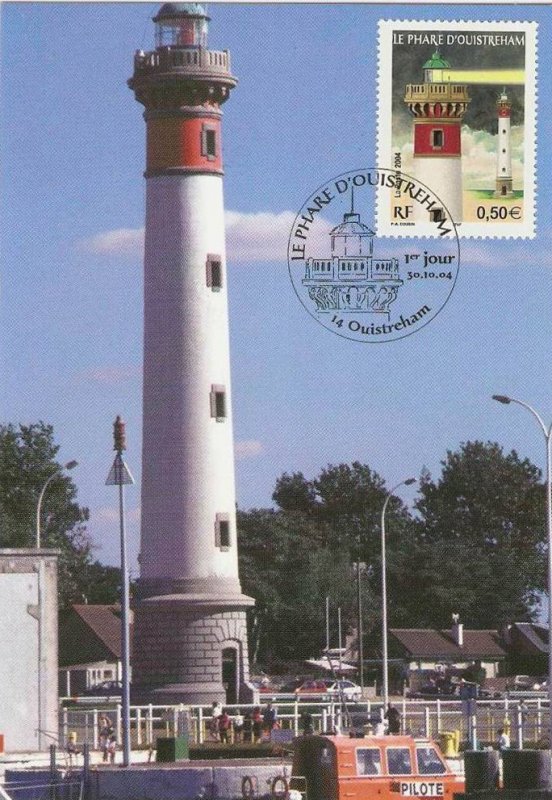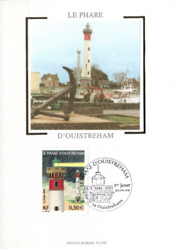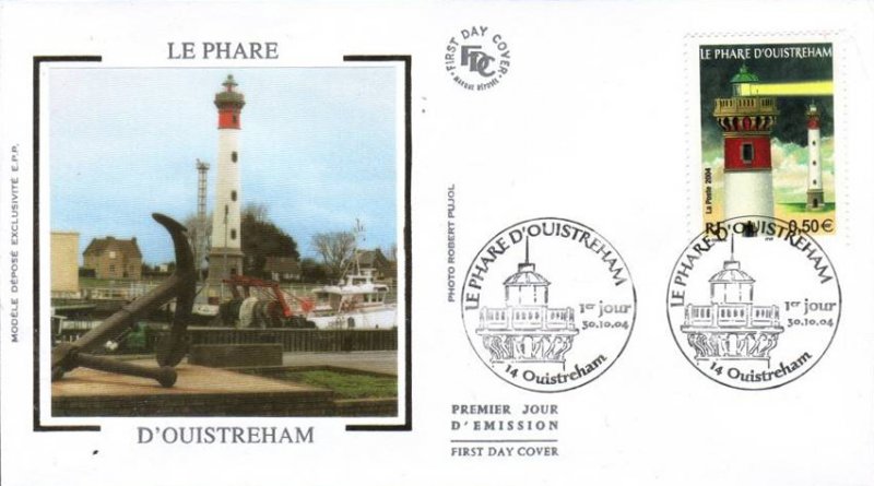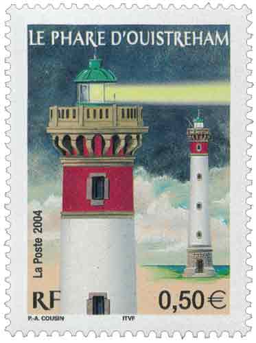 | Commentaire | En octobre 2004, La Poste édite un timbre commémorant le centenaire de la mise en service du phare d’Ouistreham. Gardien de l’estuaire de l’Orne, sa construction a débuté en 1903. Ce phare à terre est une tour cylindrique en granit peint (rouge et blanc), d’une hauteur d’environ 38 m. Ce timbre est par ailleurs émis à l’occasion du Challenge Pasteur 2004, le championnat de France de philatélie jeunesse se déroulant à Ouistreham les 30-31 octobre et 1er novembre. Le visuel présente le phare sur fond de tempête, phare dont le faisceau lumineux est recouvert d’encre phosphorescente. |
