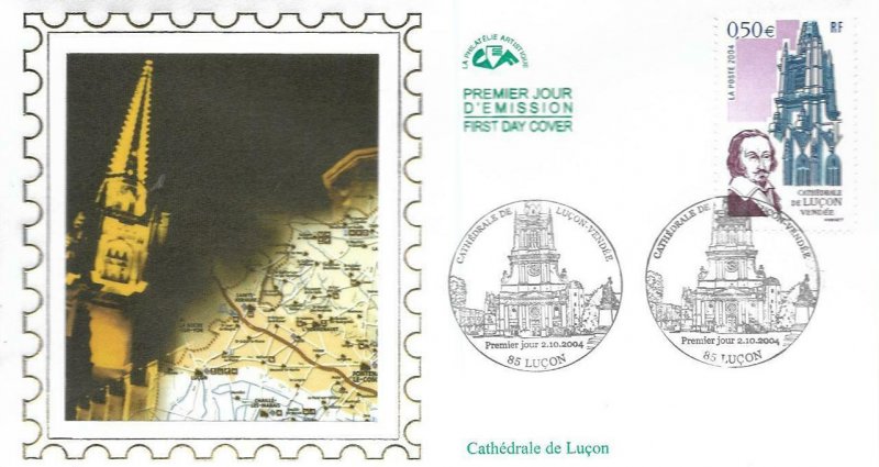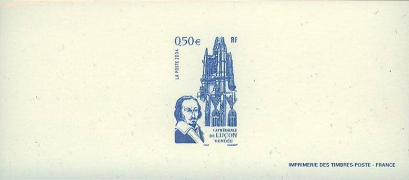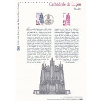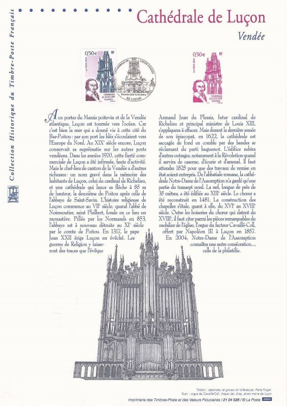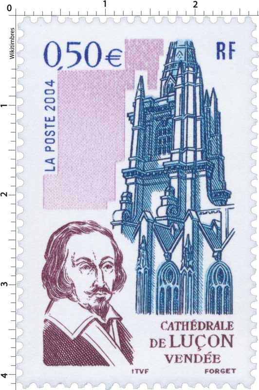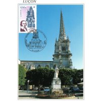 | Commentaire | Antique monastère fondé par Saint-Philbert au VIIe siècle, devenu évêché par la volonté du Pape Jean XXII, la cité est, sans conteste, la capitale spirituelle du Bas-Poitou. Le cardinal de Richelieu, avant de devenir le premier ministre de Louis XIII, le grand maître de la diplomatie française et le héros ténébreux d’Alexandre Dumas, en fut l’évêque réformateur et attentif. Il s’appliqua avec passion à rebâtir la ville détruite par les guerres de religion. La Poste a choisi de représenter le portrait du Cardinal de Richelieu et une vue depuis le cloître de la Cathédrale de Luçon. |