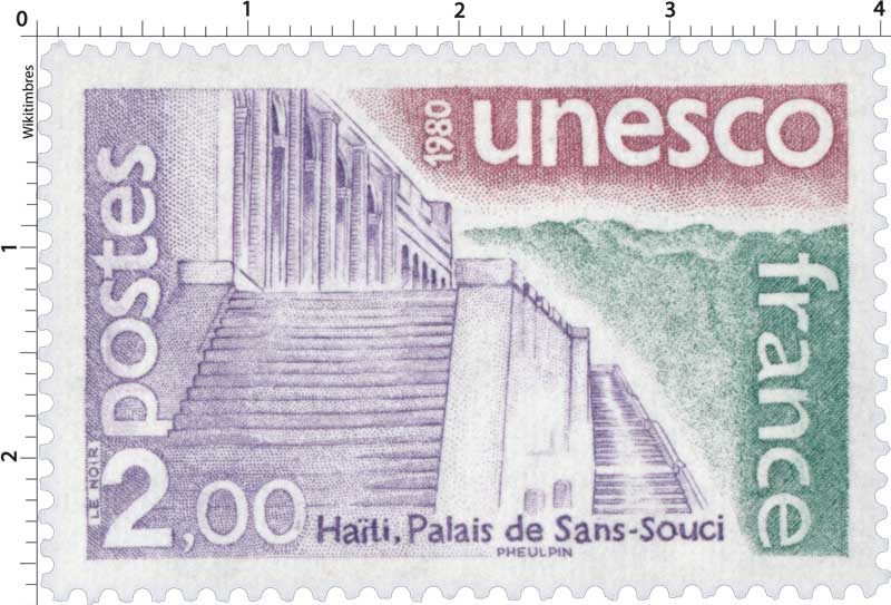 Timbre : 1980 Unesco Haïti, Palais de sans-souci Mesures Format d'imp 36 x 22 mm Dents incluses 40 x 26 mm Forme horizontal Phosphore Non Impression - Complément xxxxx Couleur rose-brun, violet et vert-gris Valeur 2 F Dentelure - Emis en - Quantité - Auteurs Dessinateur xxxxx Graveur xxxxx Mise en page xxxxx Mentions - Numéros & Dates N° Philatelix TS63 N° Michel 23 Date d'émission 15/11/1980 Date de retrait - Classements Groupe De service 1980 Catégorie Timbres de service Familles châteaux / palais constructions patrimoine Usage - Régions - Départements - Description U.N.E.S.C.O. Patrimoine universel. Sites classés à protéger : Haïti, Palais de Sans-Souci Commentaire - Mes timbres & notes personnelles www.wikitimbres.fr