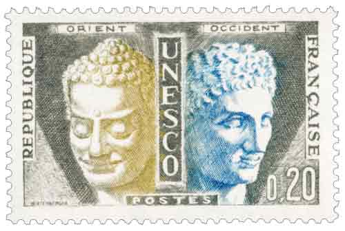 | Commentaire | Premier timbre de service de l'Unesco, Tête de Bouddha et Hermès de Praxitèle |