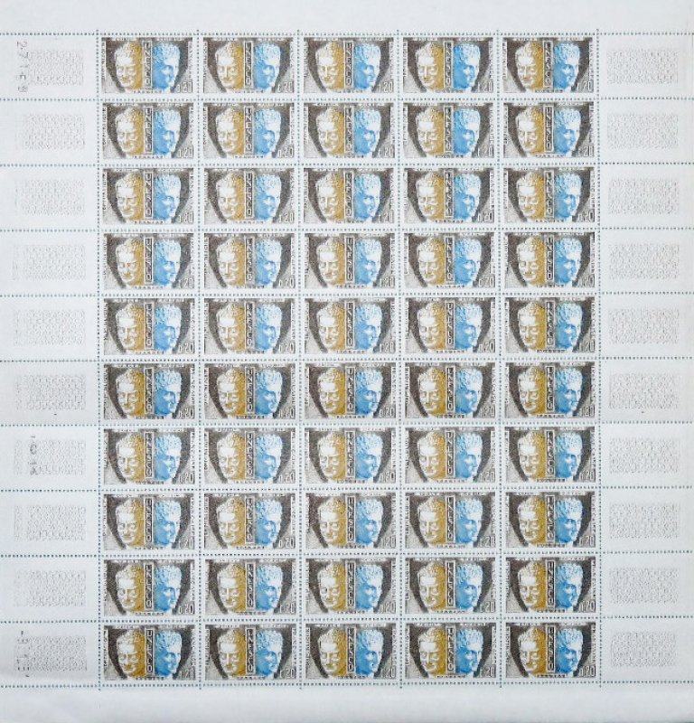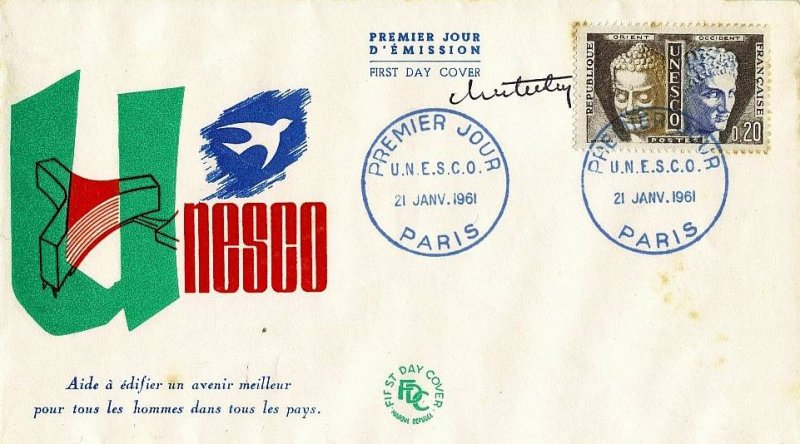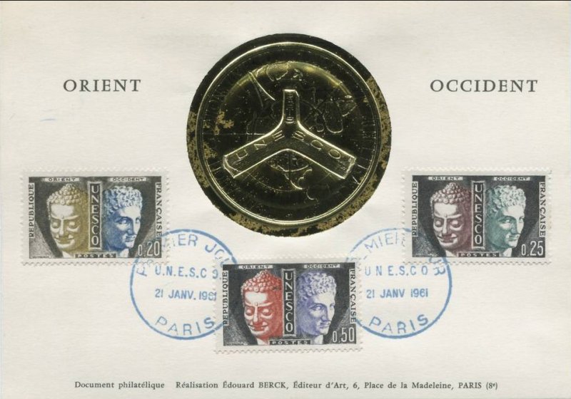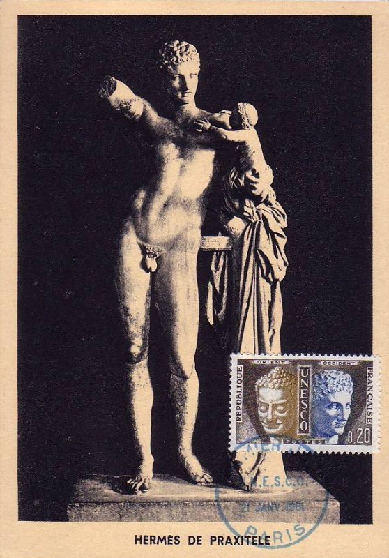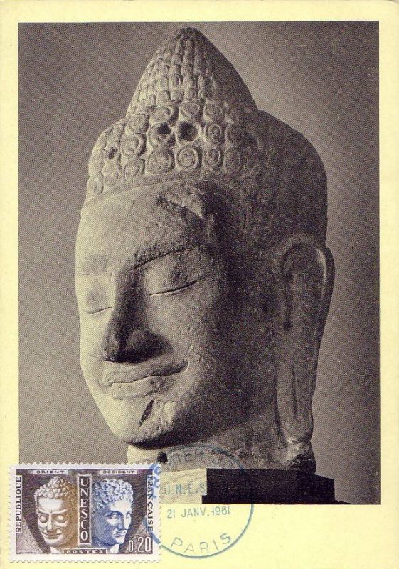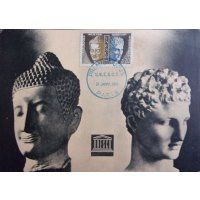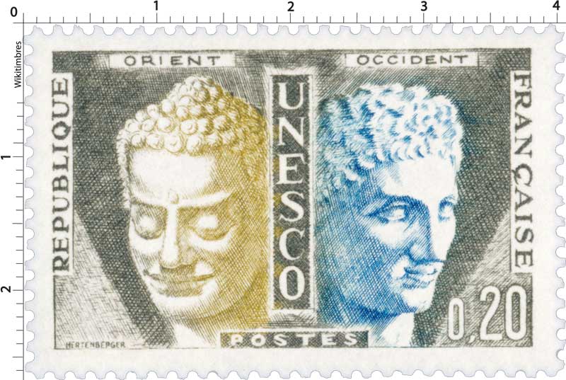 | Commentaire | Premier timbre de service de l'Unesco, Tête de Bouddha et Hermès de Praxitèle |
