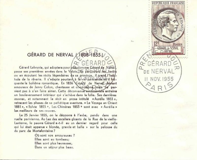 | Description | Centenaire de la mort de l’écrivain Gérard Labrunie dit de Gérard de Nerval (1808-1855), né à Paris |