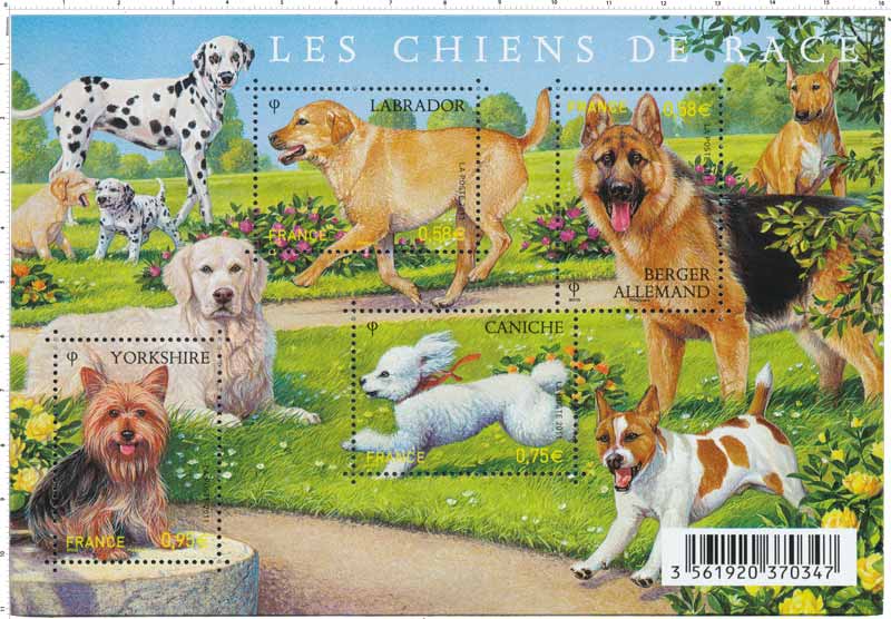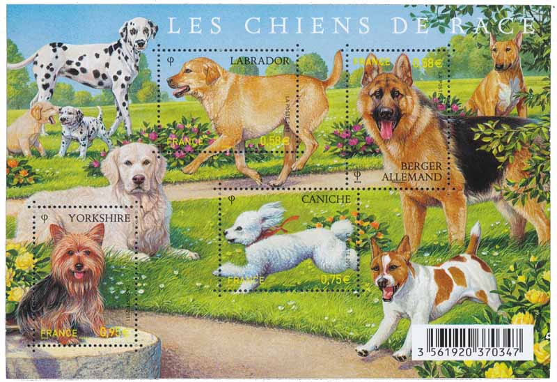 | Commentaire | Quatre chiens de race figurent sur Les timbres du bloc Nature : Le Labrador, le Berger allemand, le Yorkshire et le caniche En 2011, la série “Nature” est consacrée aux chiens de race. Quatre d’entre eux ont été retenus pour illustrer cette série : le labrador, le berger allemand, le yorkshire et le caniche. Le labrador, qu’il soit jaune, chocolat ou noir, est l’un des chiens de compagnie les plus polyvalents. Bon chien de chasse, ainsi que chercheur de drogue, c’est aussi un chien de sauvetage et un guide d’aveugle exceptionnel. Le berger allemand, lui aussi, rend autant de services exceptionnels : chien de garde, guide d’aveugle, sauveteur en montagne, il est souvent aussi chien policier. Timbre à date “Premier Jour” conçu par Jean-Paul Cousin |
