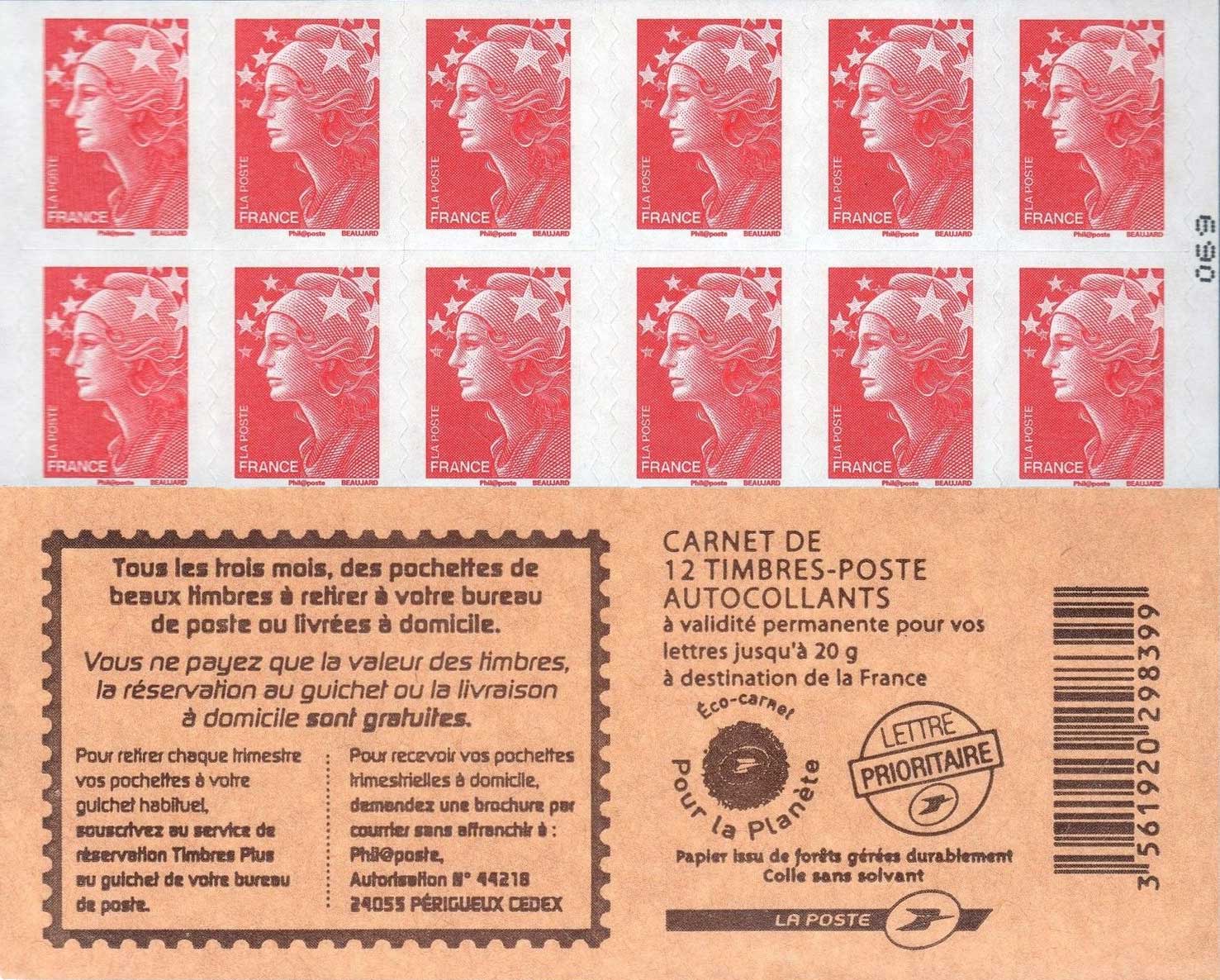 | Description | Carnet Marianne, couverture “Réservataires Timbres Plus”12 TVP rouge, Lettre 20 g |