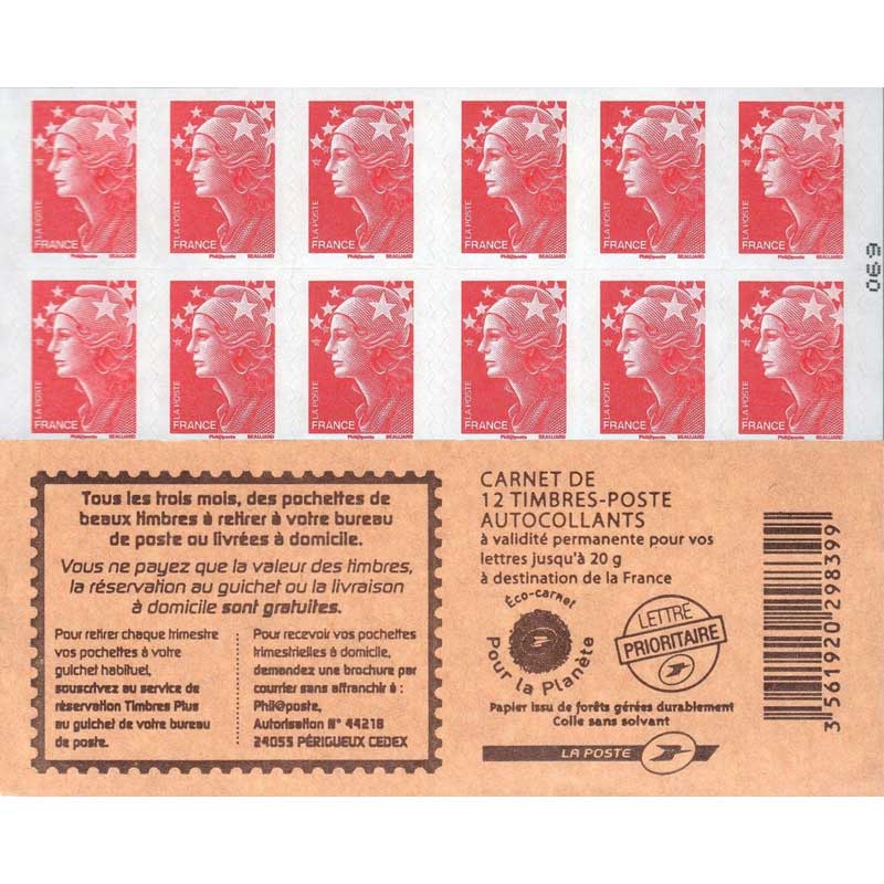 | Description | Carnet Marianne, couverture “Réservataires Timbres Plus”12 TVP rouge, Lettre 20 g |