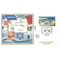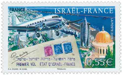 | Commentaire | Les deux timbres d'Israël sont émis par Israël Post le 6 novembre 2008. Les illustrations sont identiques. Les valeurs faciales émises sont de 1,60 nouveau shekel (départ de Haïfa , premier échelon du tarif intérieur de la lettre simple) et de 3,80 shekels (arrivée à Paris , premier échelon pour une lettre simple à destination de la France). Les tabs reproduisent des marques postales apposées sur les courriers transportés lors du vol de 1948. Pour illustrer les 60 ans de relations diplomatiques entre l’état d’Israël et la France, les administrations postales de ces 2 pays réalisent une émission commune ayant pour thème le 1er vol entre les 2 états, le 12 juin 1948. Le timbre à 0,55 € évoque le vol au départ d’Haïfa et présente un pli au départ d’Haïfa sur un fond composé de vues de cette ville aujourd’hui. |