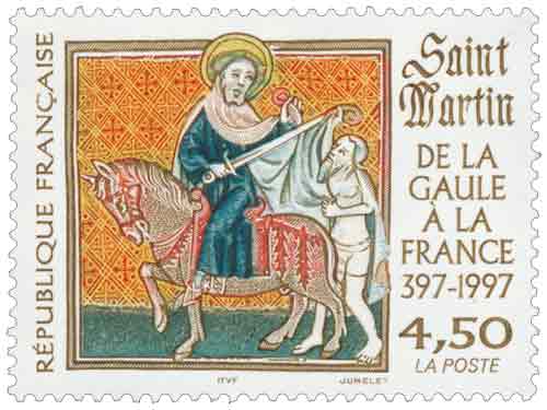 | Description | De la Gaule à la France. Saint Martin (320-397), 1600e anniversaire sa mort à Candes-Saint-Martin. Enluminure du XIVe siècle, dans la scène traditionnelle du partage de son manteau avec un pauvre |