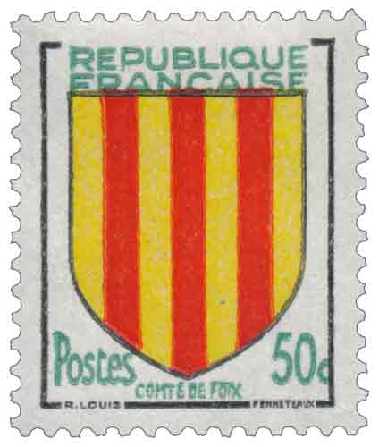 | Commentaire | Émis en 1955 dans le cadre de la huitième série des Armoiries des provinces françaises, le timbre consacré aux armoiries du Comté de Foix s’inscrit dans la continuité des émissions héraldiques françaises de l’après-guerre, destinées à rappeler l’ancrage historique des anciennes provinces dans le territoire national, la composition reprenant l’écu traditionnel de Foix — d’or à trois pals de gueules — rendu avec une grande lisibilité malgré le petit format, l’impression typographique polychrome mettant en valeur la force symbolique des couleurs héraldiques tout en répondant à un usage postal utilitaire précis, ce timbre étant principalement destiné à l’affranchissement des journaux, fonction caractéristique de cette série à faible valeur faciale, tandis que son maintien à la vente jusqu’en 1958 témoigne de son rôle durable dans la circulation quotidienne du courrier imprimé et de la volonté de diffuser largement une iconographie provinciale standardisée dans la France des années 1950. |