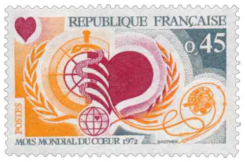 | Commentaire | Ce timbre-poste français émis en 1972 s’inscrit dans la campagne internationale du Mois mondial du cœur, organisée sous l’impulsion de l’Organisation mondiale de la Santé, afin de sensibiliser l’opinion publique à la gravité et à l’extension des maladies cardio-vasculaires, alors déjà identifiées comme la première cause de mortalité dans le monde industrialisé. Par cette émission, la France rejoint cinquante et une nations engagées dans une action coordonnée mêlant information, prévention et soutien à la recherche médicale, tout en soulignant le rôle éducatif du timbre-poste comme vecteur de messages de santé publique. Le visuel, dessiné et gravé en taille-douce par Jacques Gauthier, adopte une composition à la fois symbolique et universelle : le caducée, emblème de la médecine, y côtoie un cœur stylisé dont les pulsations sont suggérées par une alternance graphique de clair et de foncé, tandis qu’un générateur d’impulsions évoque la surveillance et la technologie médicale modernes. L’ensemble renvoie à la formule choisie pour la campagne internationale : « Le cœur au cœur de la santé ». L’émission intervient dans un contexte où la prévention devient un enjeu majeur : information du public sur les facteurs de risque, amélioration de la prise en charge des urgences cardiaques, développement des équipements hospitaliers et soutien aux sociétés de cardiologie chargées de former médecins, personnels soignants et patients. Sur le plan postal, la valeur faciale de 0,45 franc correspondait à l’affranchissement du pli non urgent du deuxième échelon de poids pour l’intérieur, assurant une large diffusion du message auprès du grand public. L’absence de surtaxe distingue ce timbre des émissions caritatives traditionnelles, mais son objectif demeure clairement civique et sanitaire. Par son iconographie sobre et moderne, ce timbre illustre l’évolution de la philatélie française vers des thématiques contemporaines, où l’enjeu n’est plus seulement commémoratif mais aussi éducatif, inscrivant l’action postale dans une dynamique internationale de santé publique et de prévention collective. Article rédigé pour WikiTimbres |