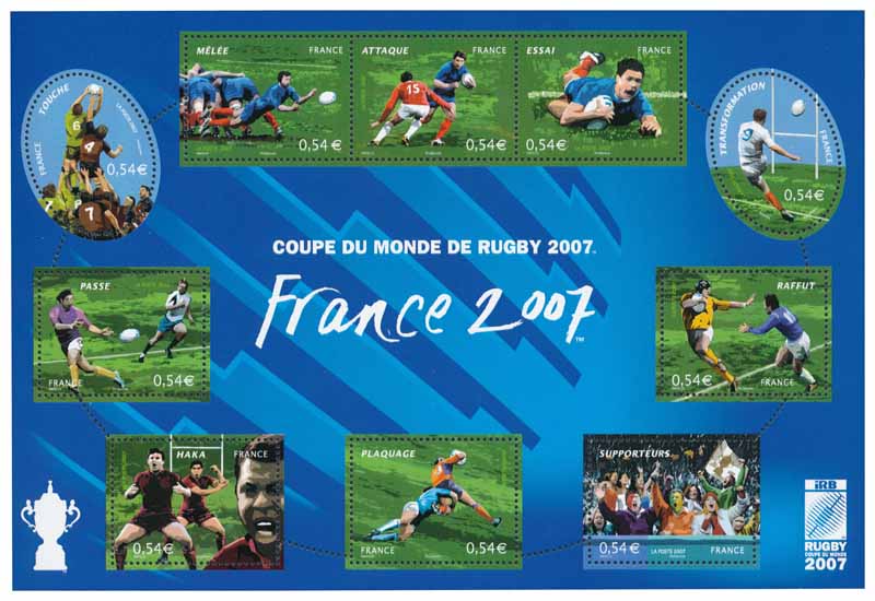 | Commentaire | COUPE DU MONDE DE RUGBY 2007 En avril 2003, les membres de l’International Rugby Board, séduits par le dossier présenté par le Président de la Fédération Française de Rugby, ont désigné la France comme pays organisateur de la VIe Coupe du Monde de Rugby (précédentes coupes 1987, 1991, 1995, 1999, 2003). Une victoire partagée avec l’Écosse et le Pays de Galles qui accueilleront en 2007 plusieurs matchs de la compétition. La VIe Coupe du Monde de Rugby aura lieu du vendredi 7 septembre 2007 au samedi 20 octobre 2007. 12 villes, dont 10 françaises, accueilleront la Coupe du Monde de Rugby 2007. Les timbres du bloc illustrent des gestes emblématiques du rugby – Touche, mêlée, attaque, essai, transformation, passe, raffut, plaquage – l’un d’eux met en scène le haka et le dernier rend hommage aux supporteurs. |