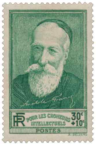 | Commentaire | Anatole François Thibault dit Anatole France (1844-1924) En savoir plus sur Wikipédia: Anatole France Émis le 16 juin 1937 en taille-douce rotative, ce timbre vertical vert rend hommage à l'écrivain, critique littéraire et lauréat du Prix Nobel de littérature 1921, Anatole France (François-Anatole Thibault, 1844–1924). L'émission est notablement caritative : elle est frappée d'une surtaxe de 10 centimes au profit des chômeurs intellectuels, une catégorie particulièrement touchée par la crise économique des années 1930. Dessiné et gravé par Antonin Delzers, le timbre symbolise l'effort de solidarité de la nation envers ses artistes, scientifiques et universitaires en difficulté. D'une valeur faciale de 30 centimes, la somme était généralement utilisée pour des affranchissements spécifiques, comme les échantillons de 50 à 100g (deuxième échelon de poids). Ce timbre faisait partie d'une émission vendue en paires avec un autre timbre (probablement Rodin, comme l'indique le tirage). Il fut émis à 1,5 million de paires et retiré de la vente le 15 mai 1938. |