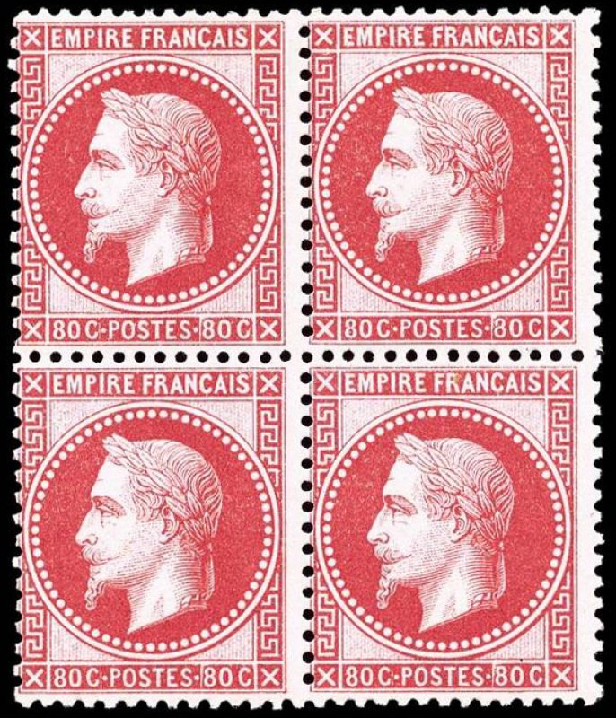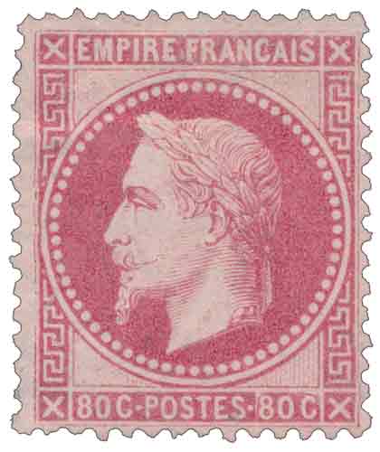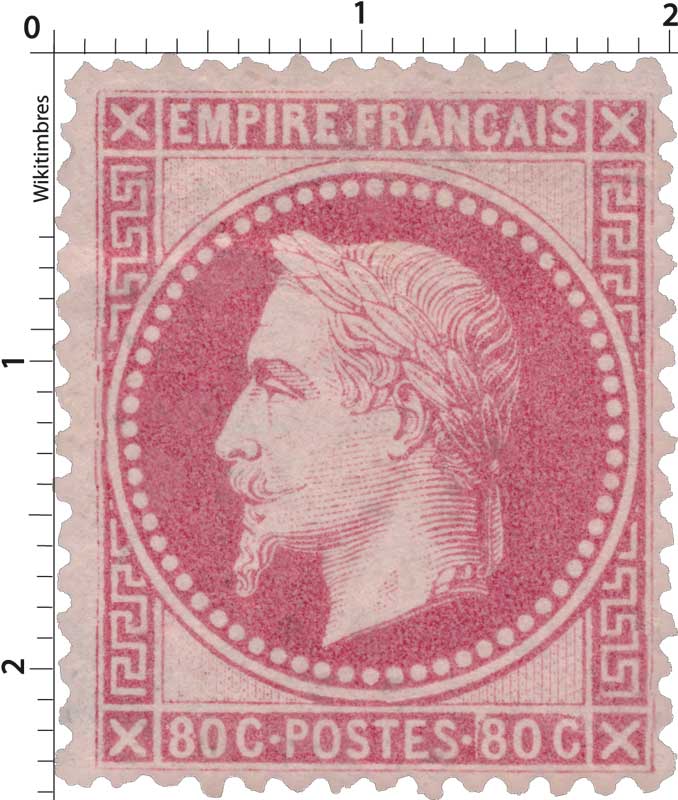 | Commentaire | Napoléon III - Empire lauré. Le 80 centimes rose, émis en octobre 1867, appartient à la série « Empire lauré » inaugurée en 1863. Comme les autres valeurs de la série, il porte la nouvelle effigie de Napoléon III couronné de lauriers, symbole officiel de prestige et de succès politique, gravée par Désiré-Albert Barre. Cette haute valeur faciale est principalement destinée aux envois lourds et aux tarifs étrangers élevés, notamment dans les correspondances pesées ou à destination de pays dont les conventions postales imposent un port supérieur au simple échelon intérieur. L’émission conserve les caractéristiques techniques des timbres dentelés français de la période : dentelure en ligne, mêmes papiers et mêmes encres que les émissions antérieures. Sa teinte rose soutenu, facilement identifiable, marque la continuité chromatique avec le 80 c non lauré qu’il remplace progressivement dans les bureaux. |
