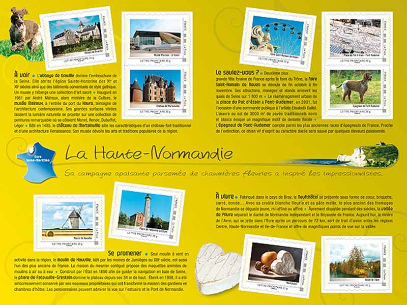 | Commentaire | Abbaye de Graville, Musée Malraux du Havre, Château de Martainville, Moulin de Hauville, Phare de Fatouville, Foire Saint Romain - Rouen, Place du Pot d'étain - Pont-Audemer, Epagneul de Pont Audemer, Neufchâtel, Vallée de l’Avre |