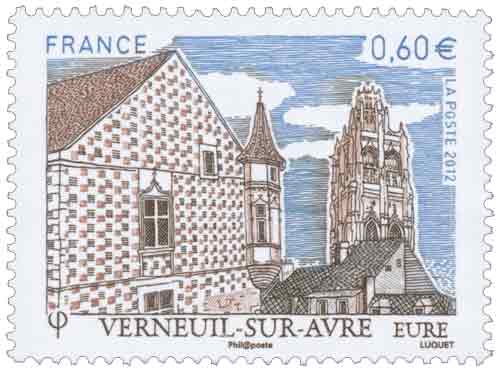 | Commentaire | Émis en 8 bandes de 6 TP Fondée en 1120 par Henri 1er Beauclerc, roi d’Angleterre, pour renforcer les défenses de la rivière d’Avre au sud de son duché, Verneuil-sur-Avre a conservé de nombreux vestiges de son passé militaire : donjon, fossés, fortifications. Après le Moyen Âge, la Renaissance et les XVIIe et XVIIIe siècles ont constitué et accru un patrimoine religieux et civil d’une valeur exceptionnelle. Des vitraux des XVe, XVIe et XIXe siècles, des statues de bois du XIIIe, des statues d’imagiers de Verneuil du XVIe siècle, des oeuvres de peintres contemporains ont progressivement enrichi de nombreuses églises. Que l’on vienne de Rouen, Chartres, Alençon ou de Paris, impossible de faire fausse route pour arriver à Verneuil-sur- Avre : la haute tour de l’église Sainte-Madeleine est visible de plusieurs kilomètres à la ronde ! Aujourd’hui, cette petite ville commerçante et active, installée au carrefour des régions de Normandie, d’Île-de-France et du Centre, est chef-lieu de canton et capitale du “Pays d’Avre, d’Eure et d’Iton”. Timbre à date “Premier Jour” conçu par Ève Luquet |