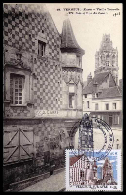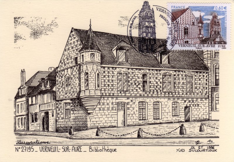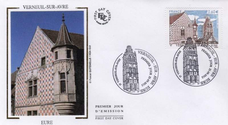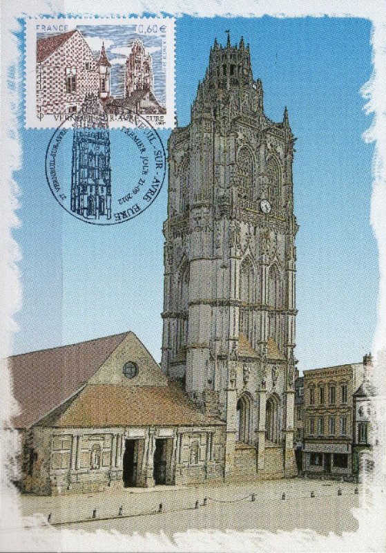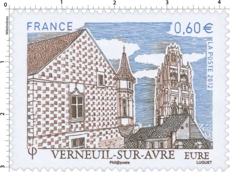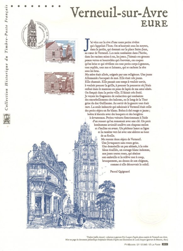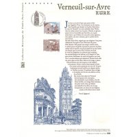 | Commentaire | Émis en 8 bandes de 6 TP Fondée en 1120 par Henri 1er Beauclerc, roi d’Angleterre, pour renforcer les défenses de la rivière d’Avre au sud de son duché, Verneuil-sur-Avre a conservé de nombreux vestiges de son passé militaire : donjon, fossés, fortifications. Après le Moyen Âge, la Renaissance et les XVIIe et XVIIIe siècles ont constitué et accru un patrimoine religieux et civil d’une valeur exceptionnelle. Des vitraux des XVe, XVIe et XIXe siècles, des statues de bois du XIIIe, des statues d’imagiers de Verneuil du XVIe siècle, des oeuvres de peintres contemporains ont progressivement enrichi de nombreuses églises. Que l’on vienne de Rouen, Chartres, Alençon ou de Paris, impossible de faire fausse route pour arriver à Verneuil-sur- Avre : la haute tour de l’église Sainte-Madeleine est visible de plusieurs kilomètres à la ronde ! Aujourd’hui, cette petite ville commerçante et active, installée au carrefour des régions de Normandie, d’Île-de-France et du Centre, est chef-lieu de canton et capitale du “Pays d’Avre, d’Eure et d’Iton”. Timbre à date “Premier Jour” conçu par Ève Luquet |